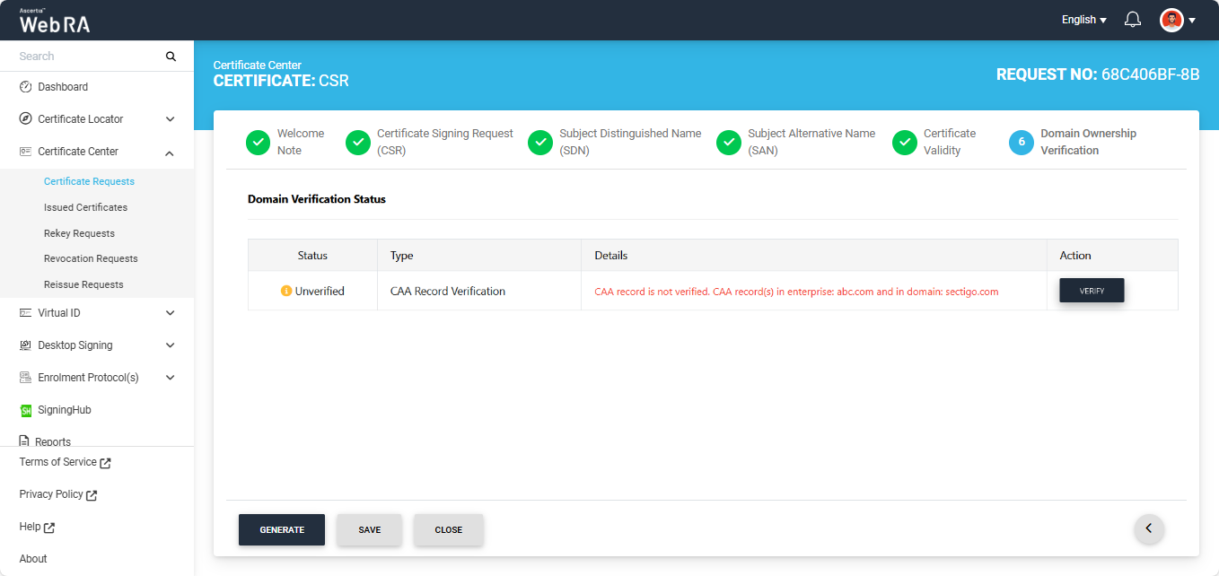 If you attempt to generate the certificate while the Domain Verification Status is ‘Unverified,’ the system will display an error dialog prompting you to verify your domain CAA records before proceeding.