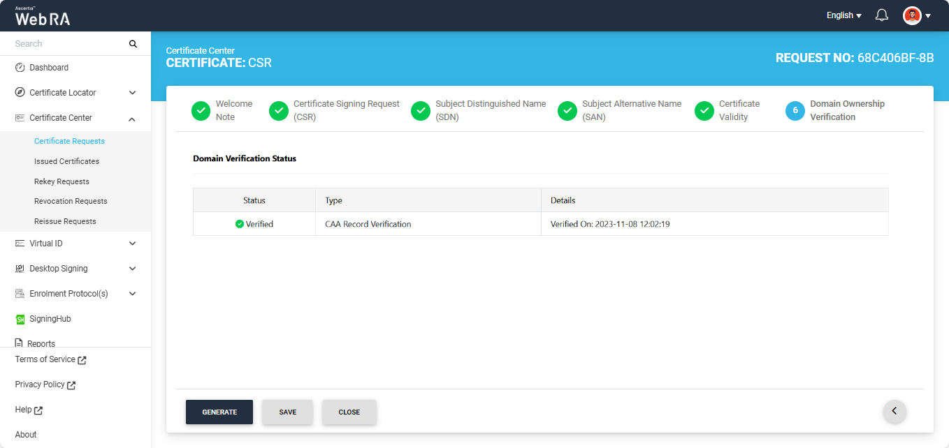 In case of Verified status, click Generate to process a certificate. The Certificate Generated confirmation message will appear, as displayed below: