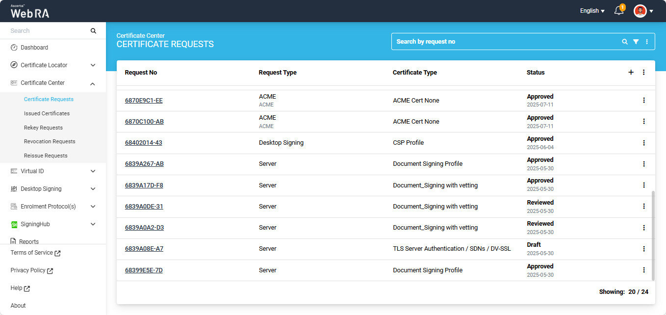 Expand Certificate Center > Certificate Requests to navigate to the Certificate Requests listing screen.