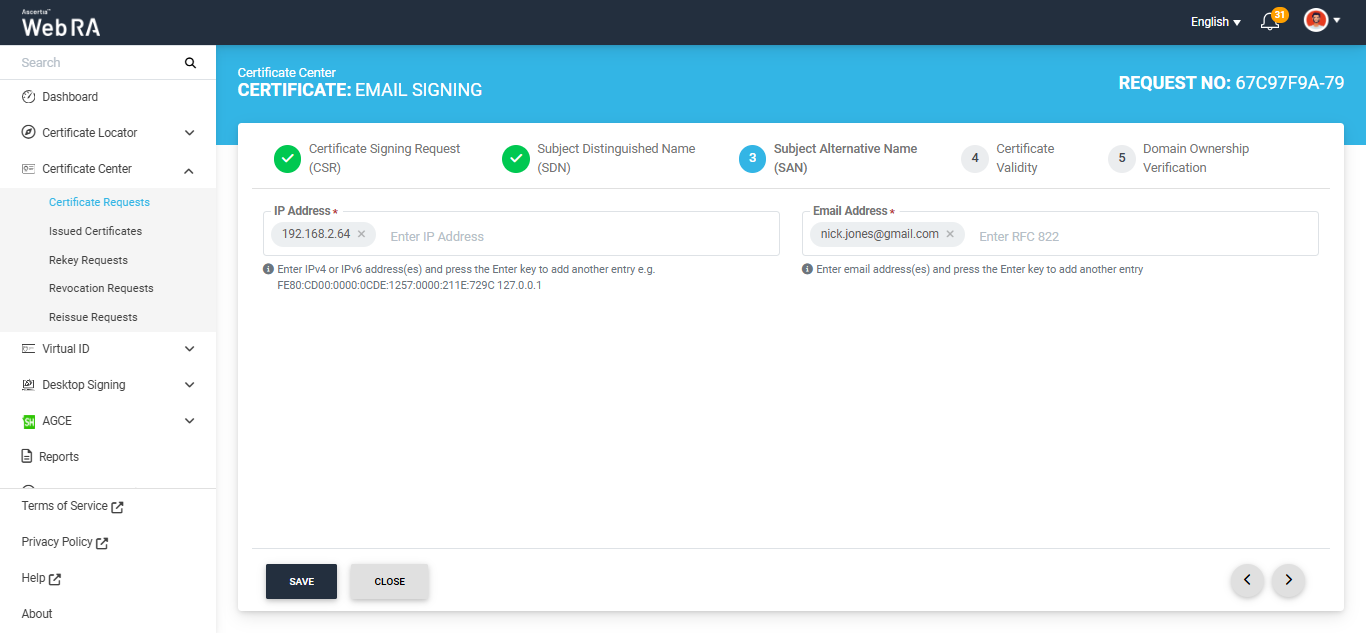 Note: If Email Validation checkbox is enabled in Configurations module and email address is present in the RFC822Name field of the Subject Alternative Names (SAN), the ownership verification screen will require you to complete email validation before generating the certificate.