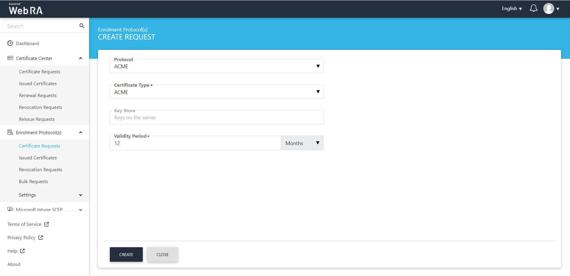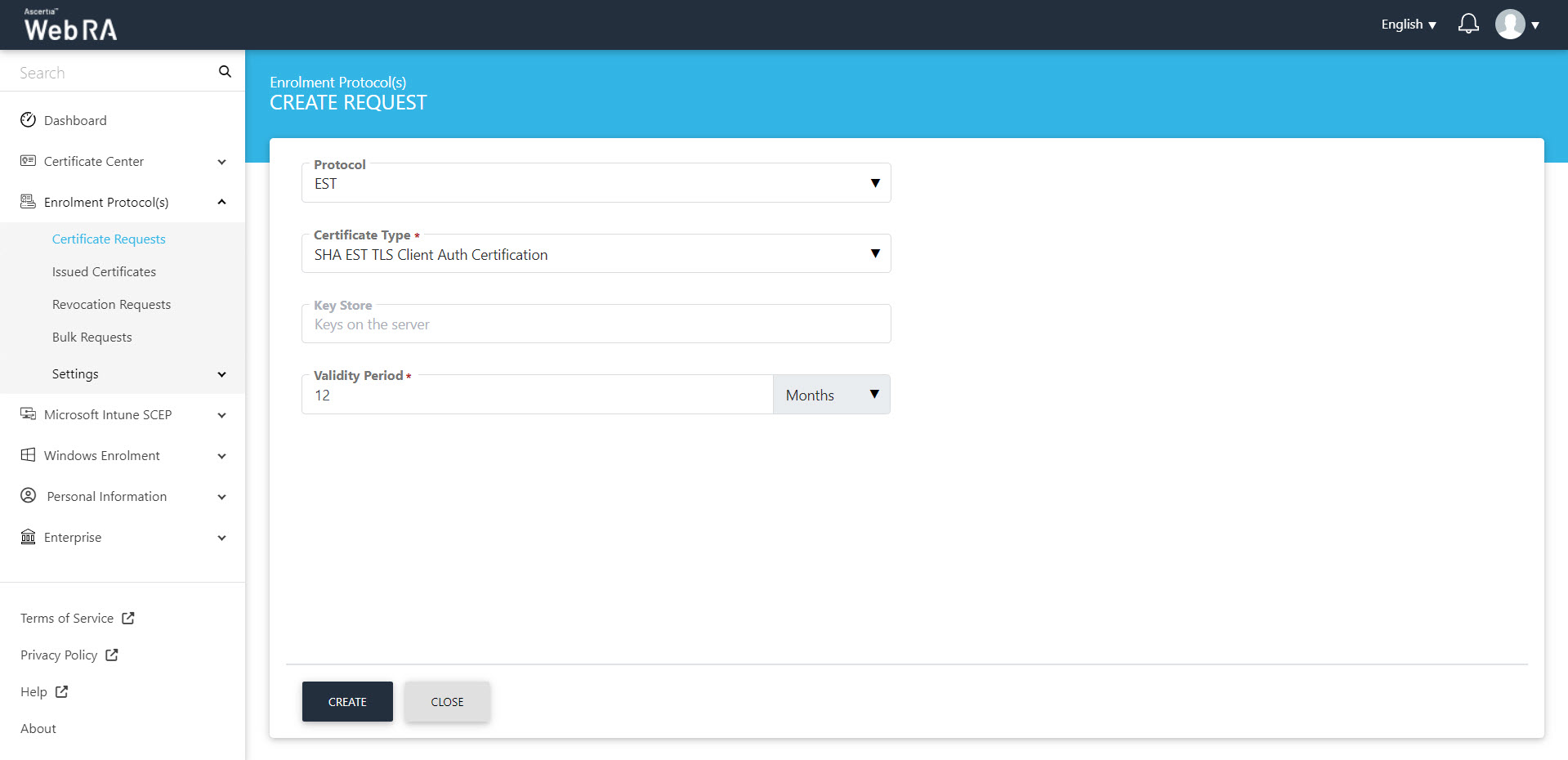 icon on top right. Select the Protocol and the Certificate Type. The key store and validity period will appear in a disabled form. Click "Create".