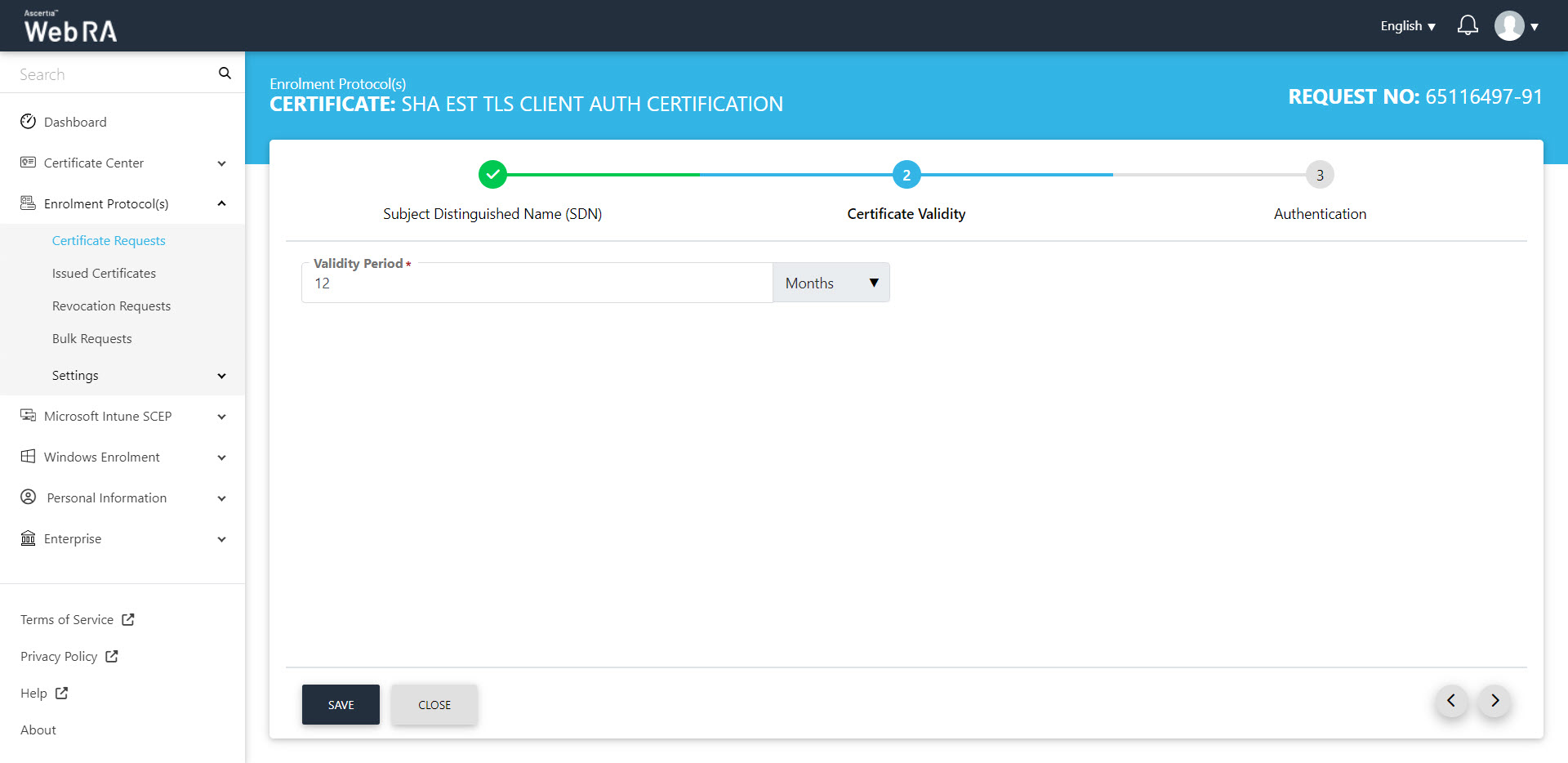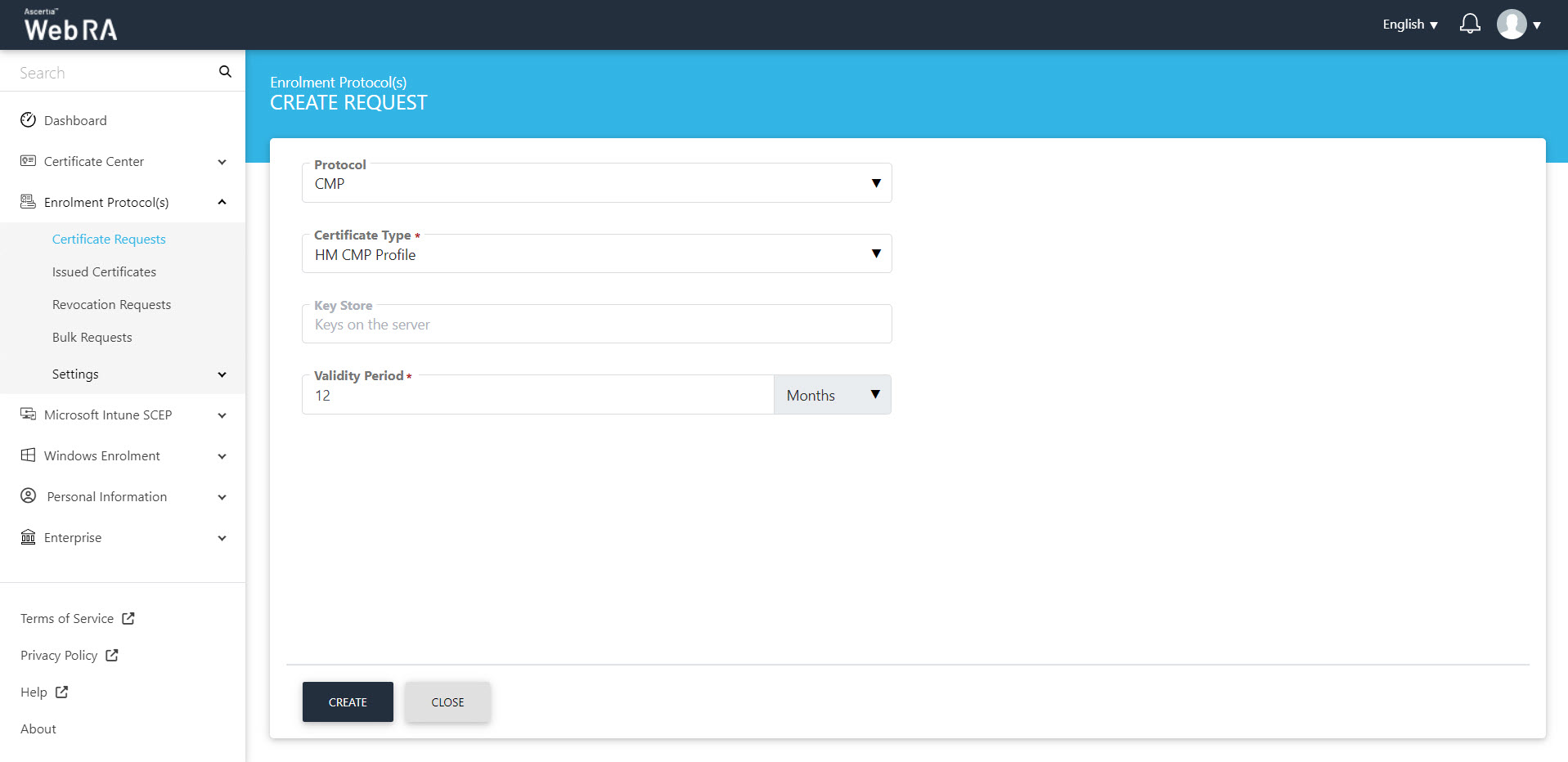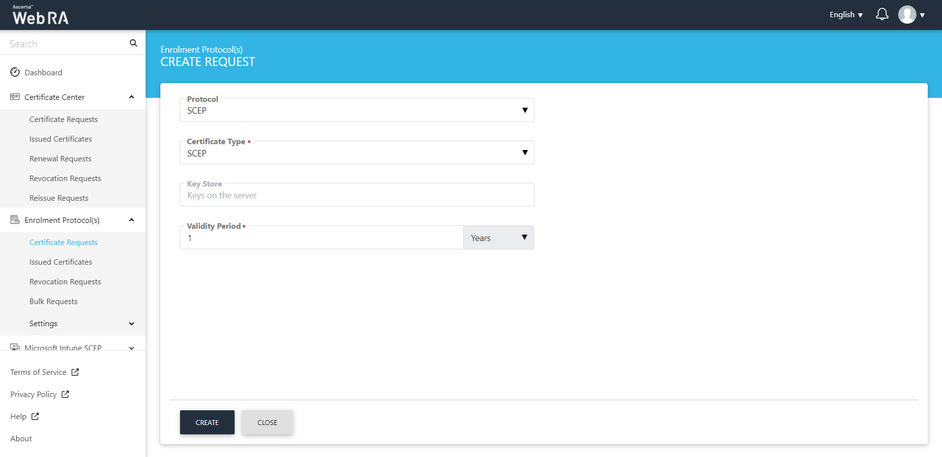- An operator will be required to select a protocol and a certificate type. Once you select the relevant profile from the certificate type drop down, the Key Store will appear auto-filled and disabled. Select a Validity Period and click Create.