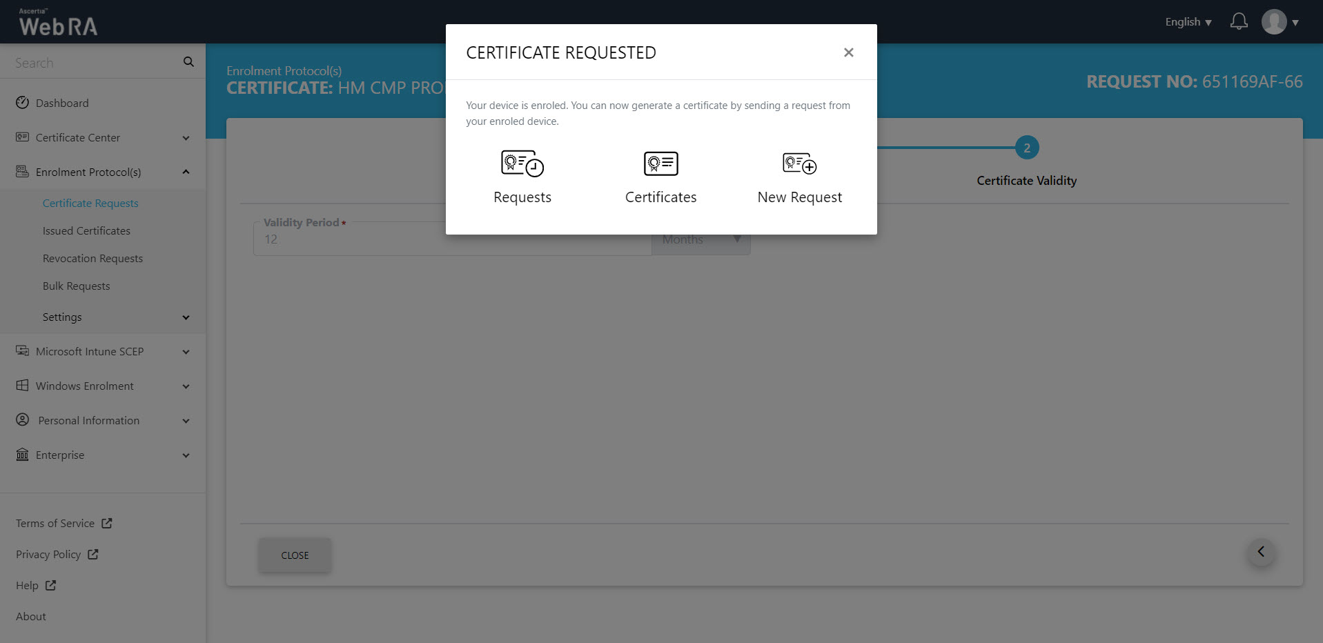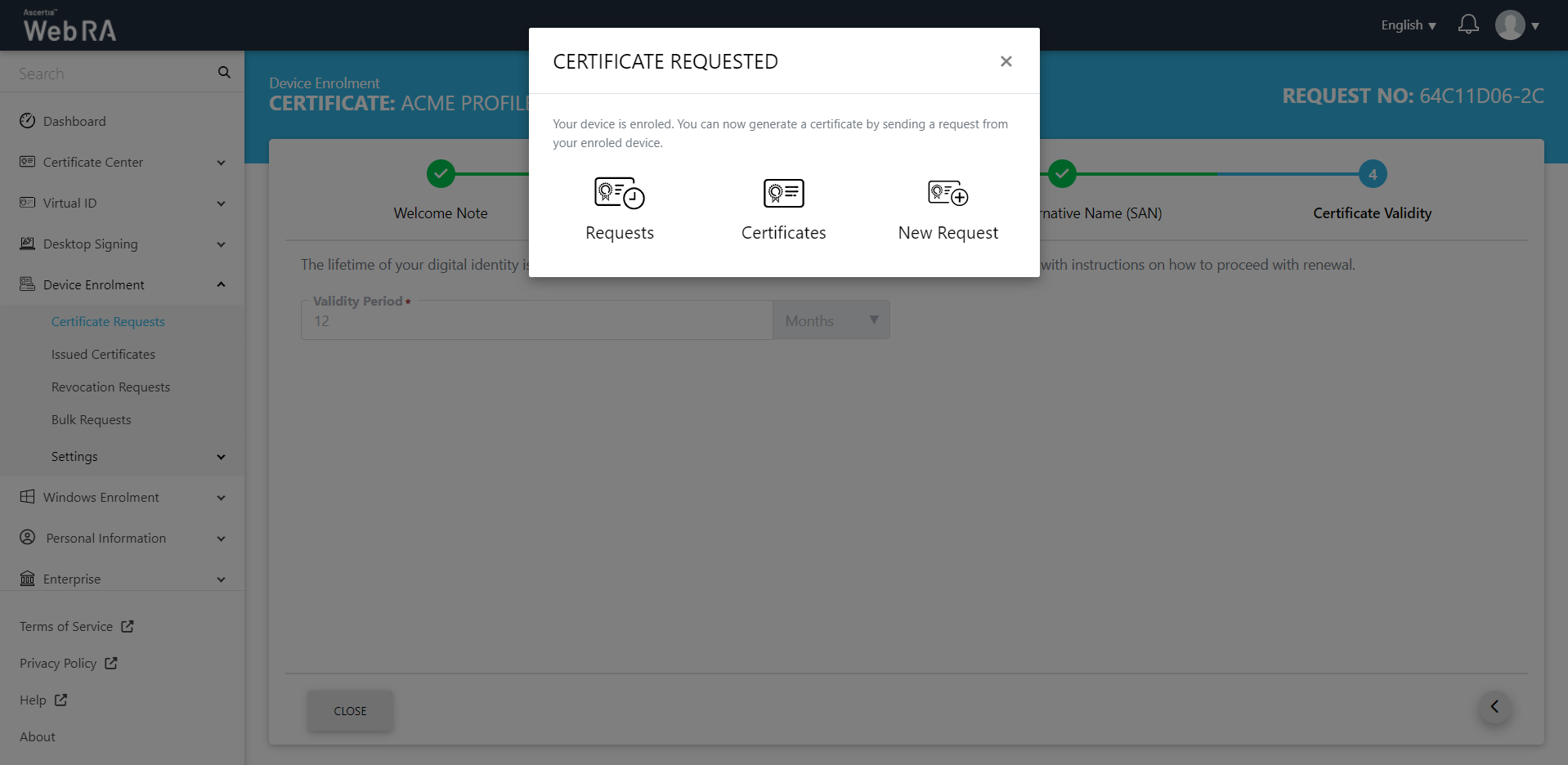 - The Certificate Requested tab will appear, stating that your device is enroled.
