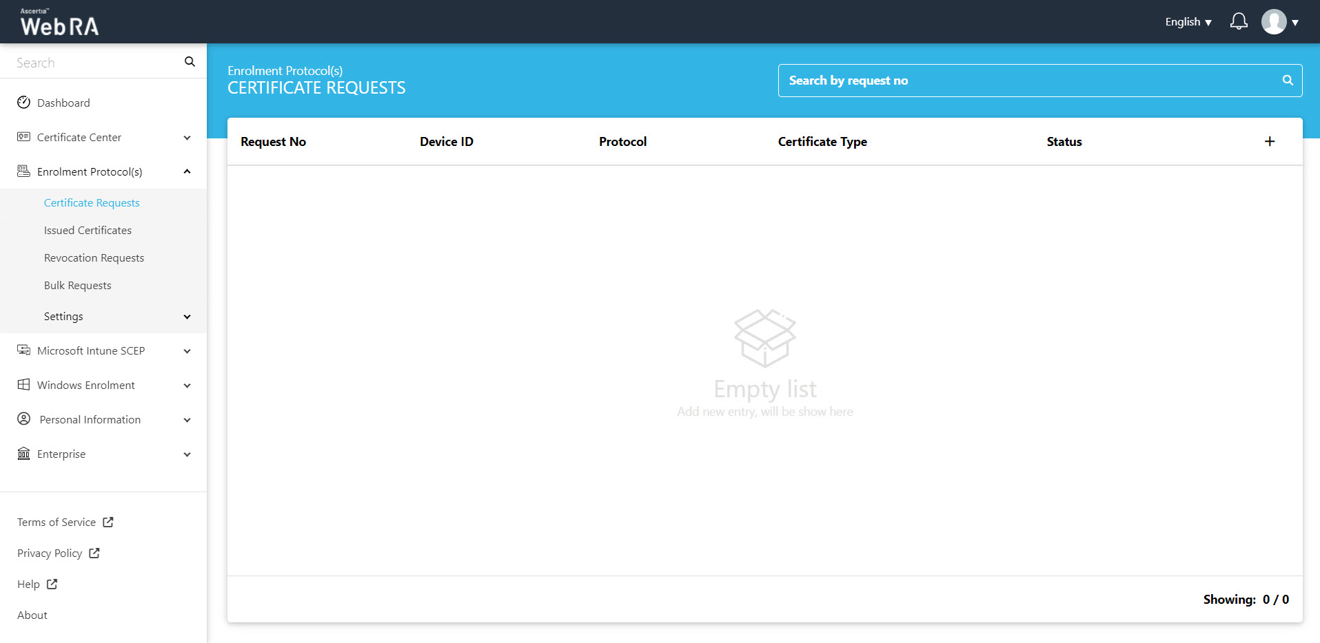 Once you have your enrolled device, all the certificate requests related to the devices user will be listed here.