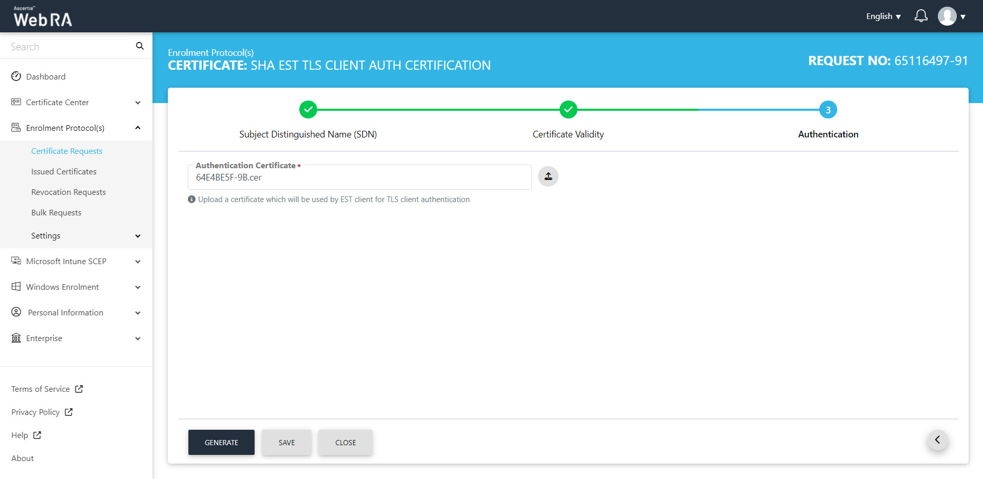 - Authentication tab will appear. Upload an authentication certificate and click "Generate".