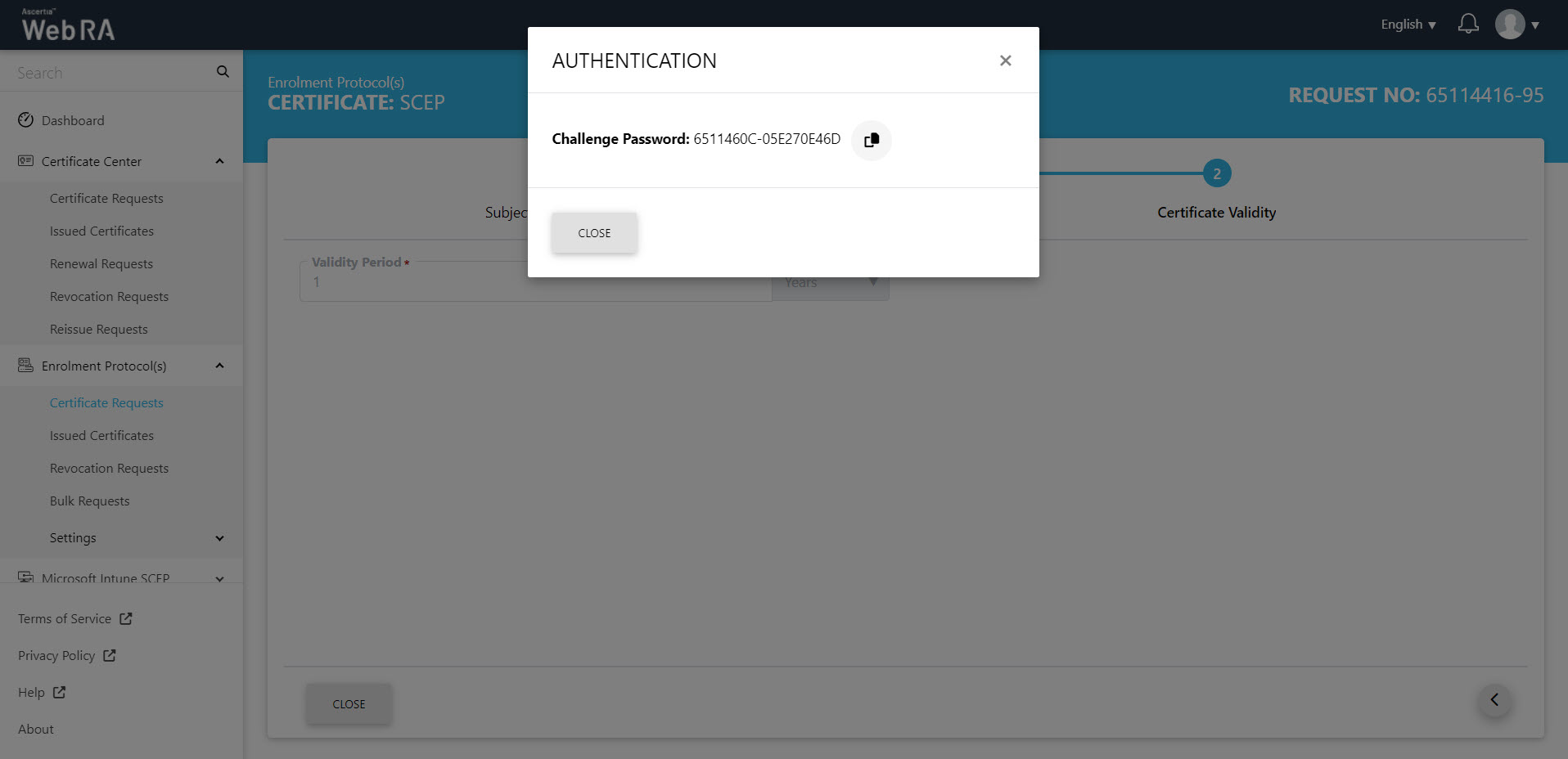 - A challenge password will be generated for request authentication. You can also copy the password.