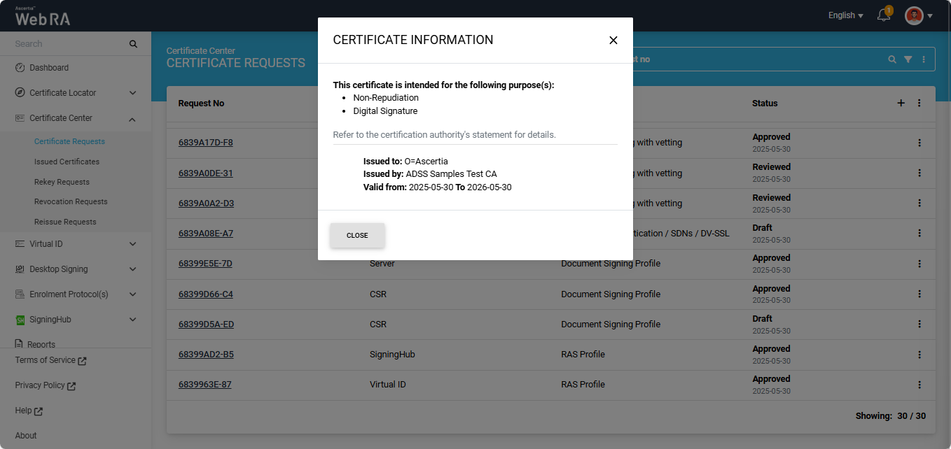 To view the certificate information, click the three-dot button next to the request. Then, click 'View Certificate' from the short menu that appears.