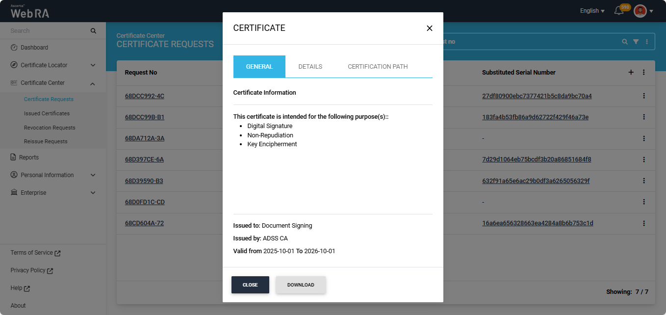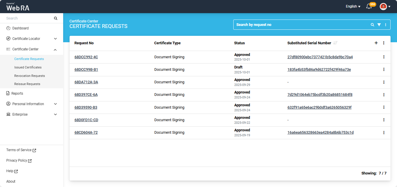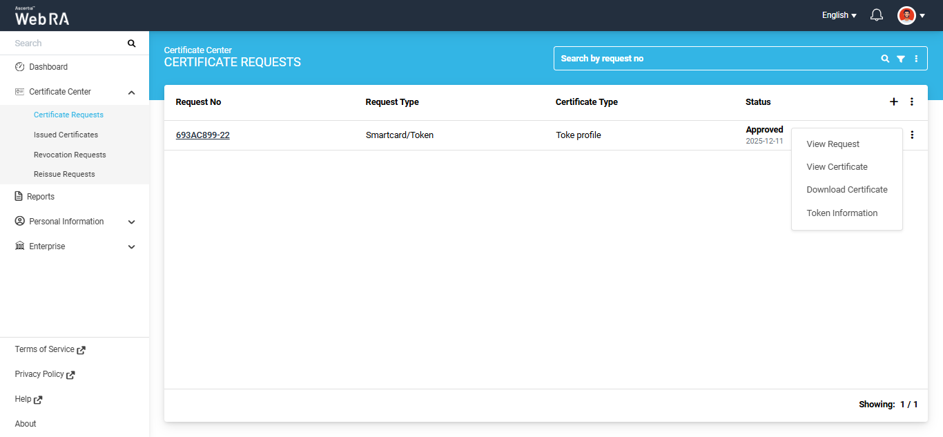 The Certificate Requests listing screen displays all the certificate requests that have been created by you from the user portal.