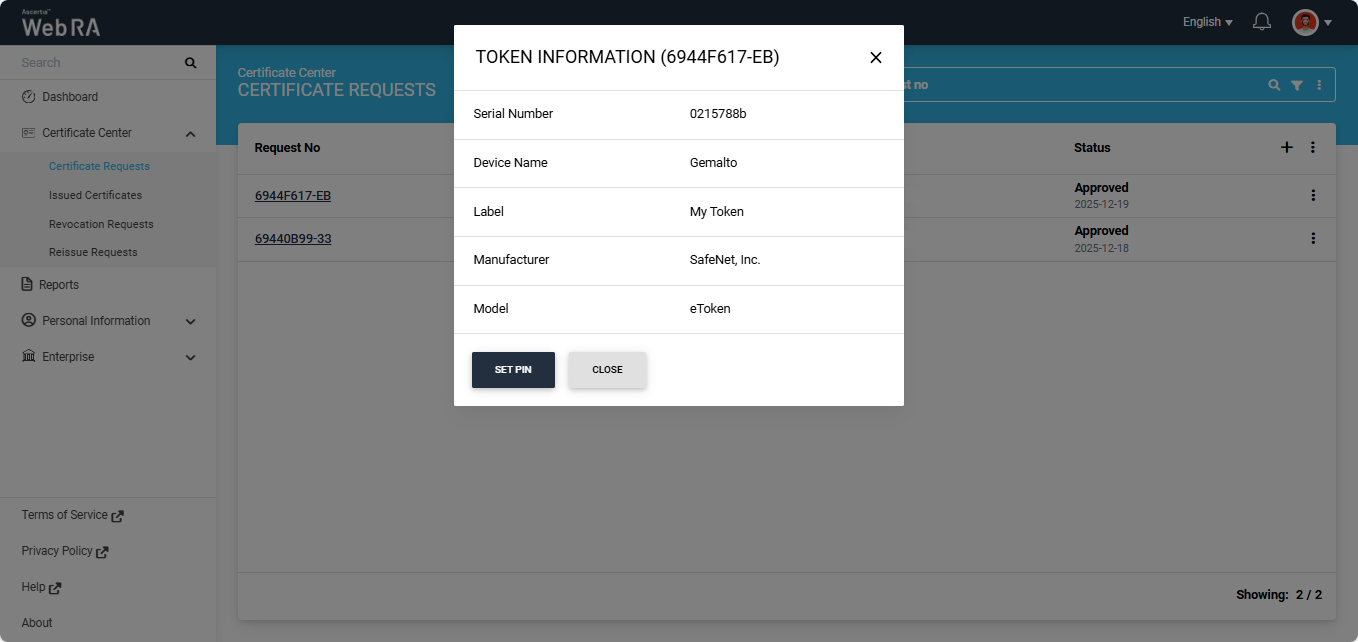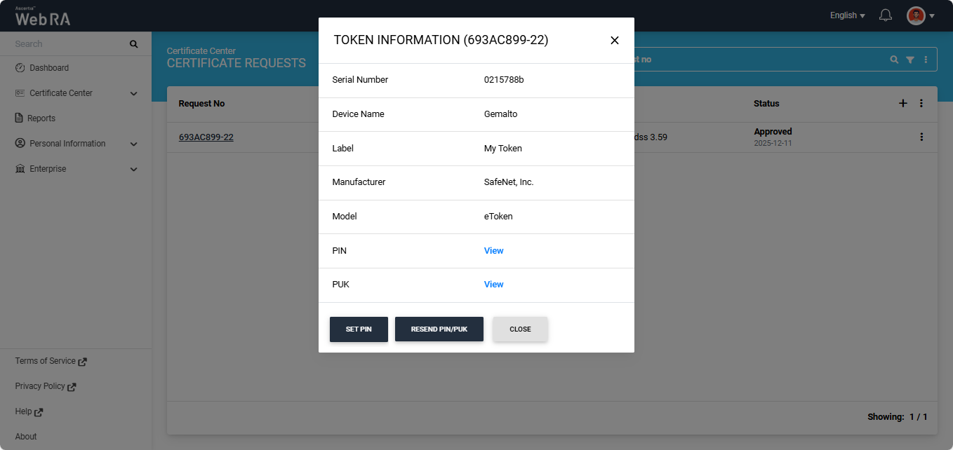 If the relevant permissions and settings are enabled in the user role and certification profile, the Token Information dialog will display the PIN and PUK information.