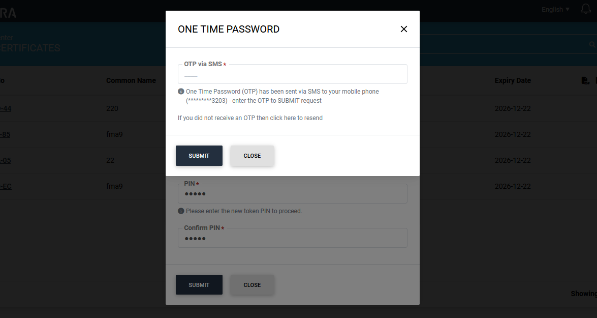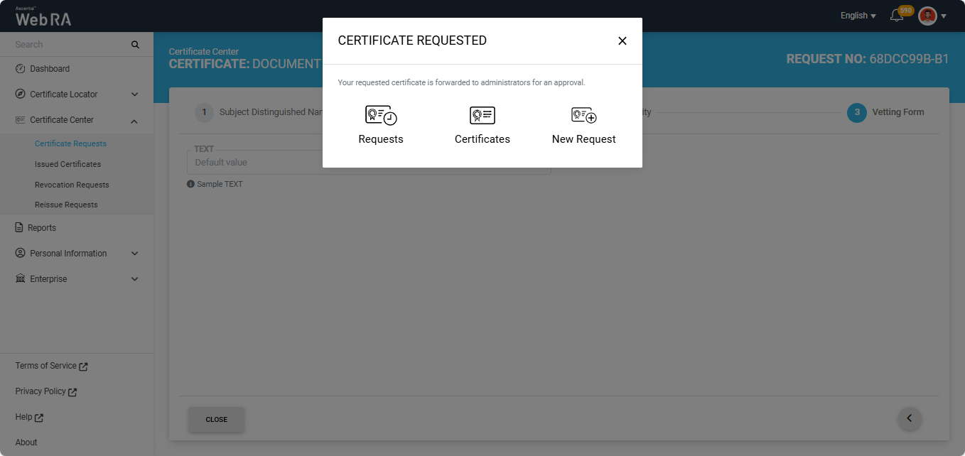 The certificate request will then be sent to the administrator for approval and the system will display the ‘Certificate Requested’ dialog on the screen.