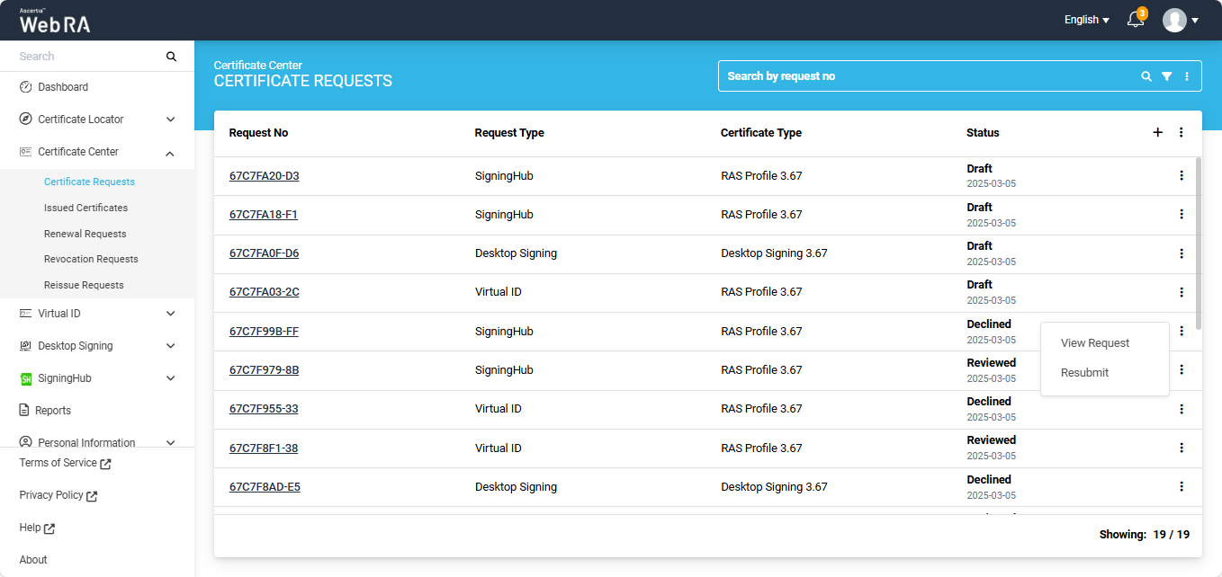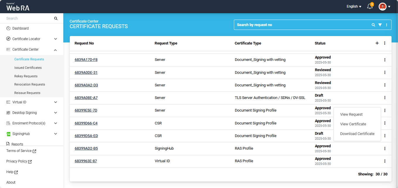 To view a certificate request, click the three-dot button next to the request. A short menu will appear on the screen, click on the 'View Request' option to check the details of the request.