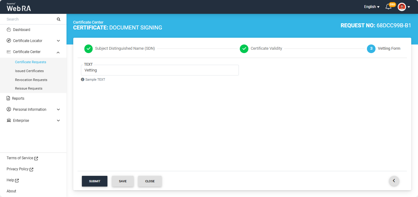 If vetting is not enabled, the system will generate the certificate immediately and download it to the user’s computer.