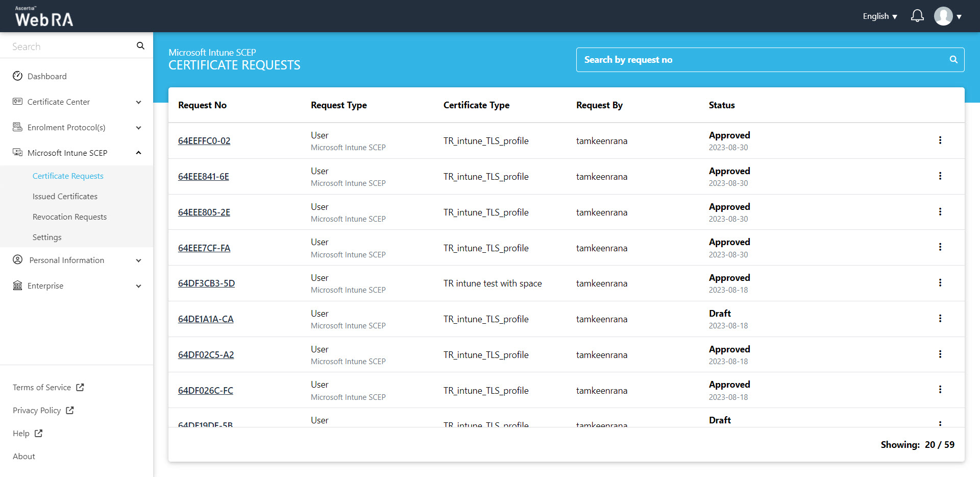 Following is a screenshot of  certificate requests pertaining to  Microsoft intune SCEP: