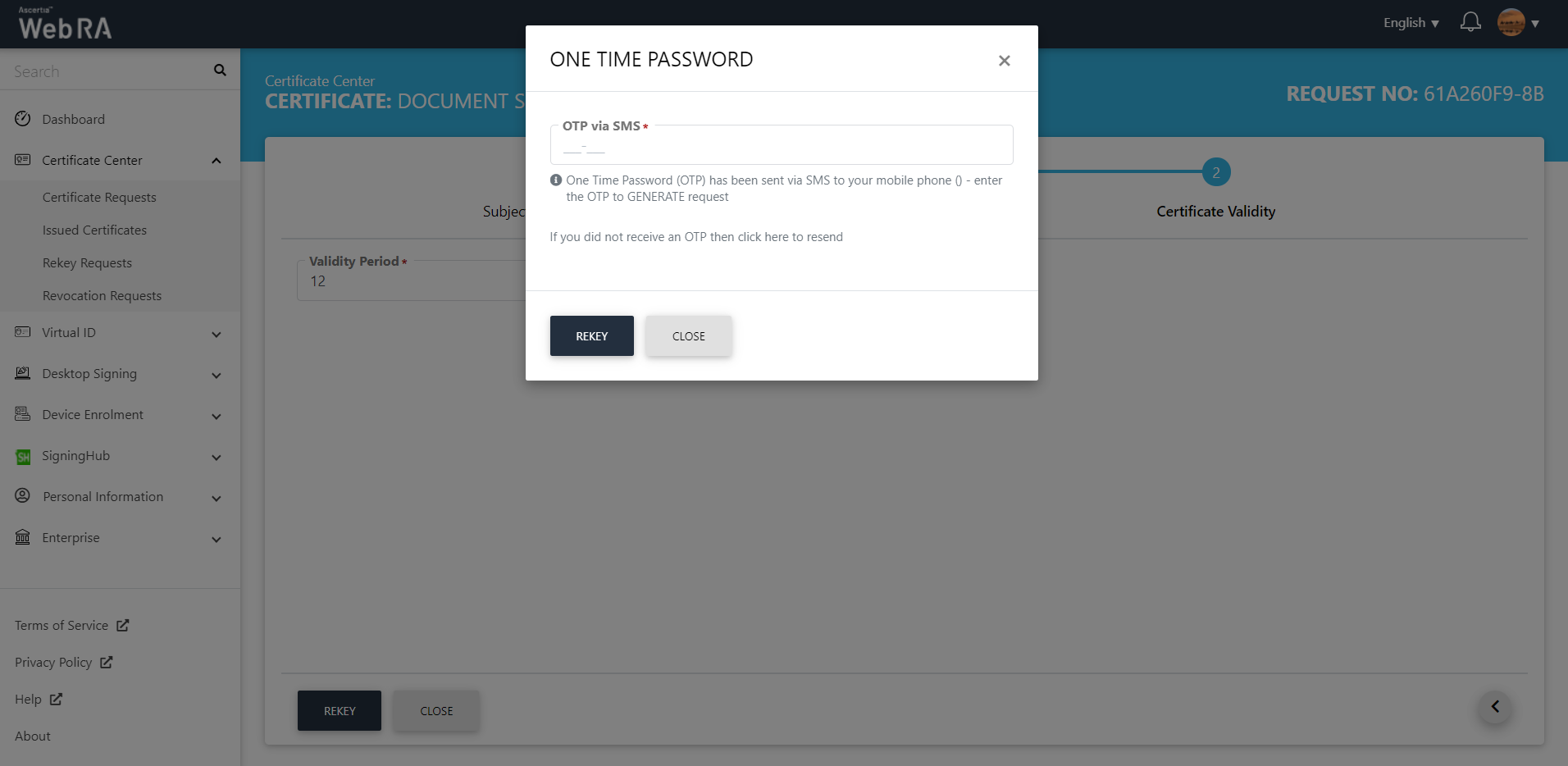 - Now click on the 'Rekey' button if the OTP is enabled in the profile, then a dialog will appear with OTP details to rekey the certificate.