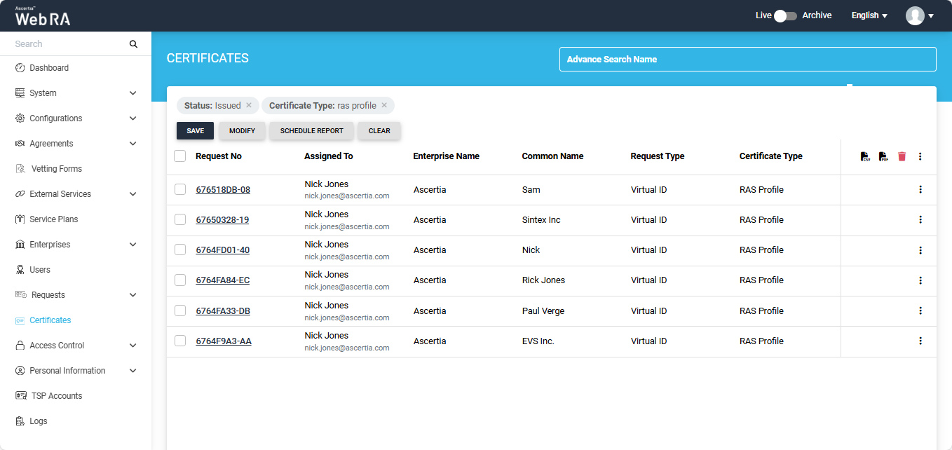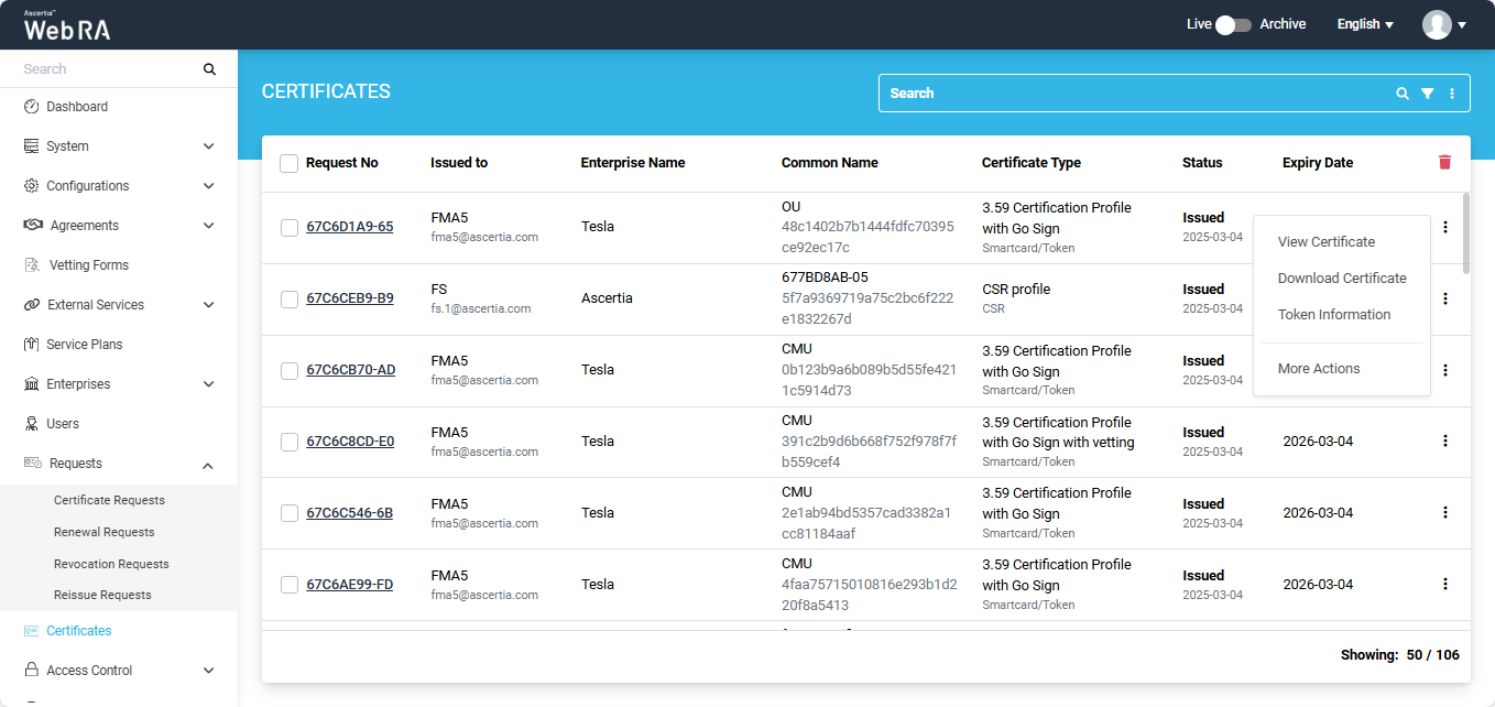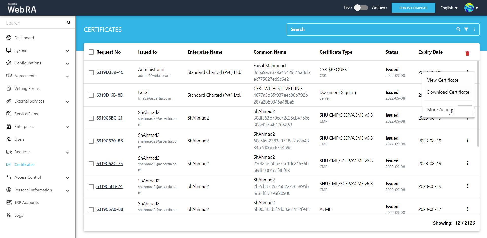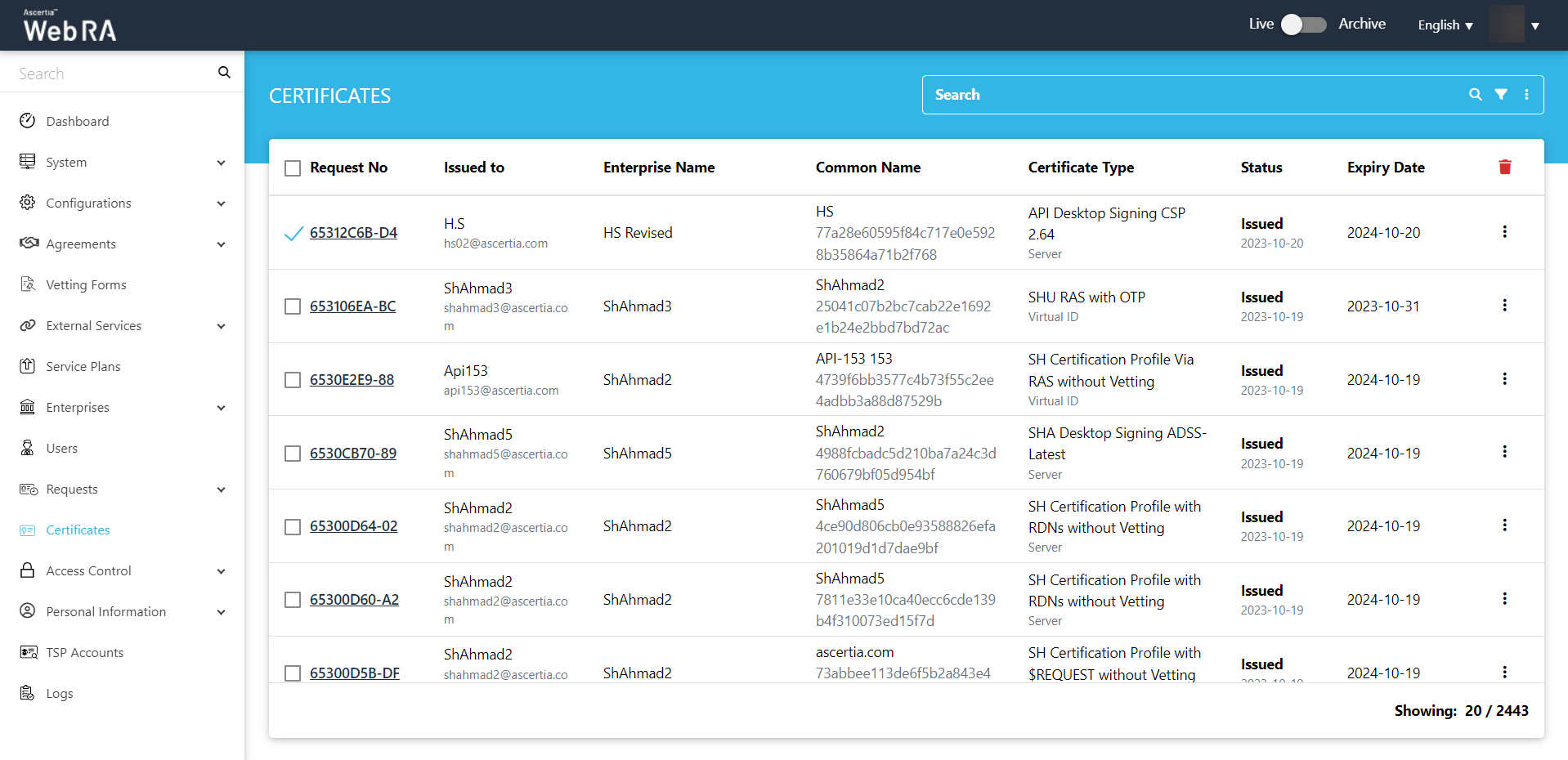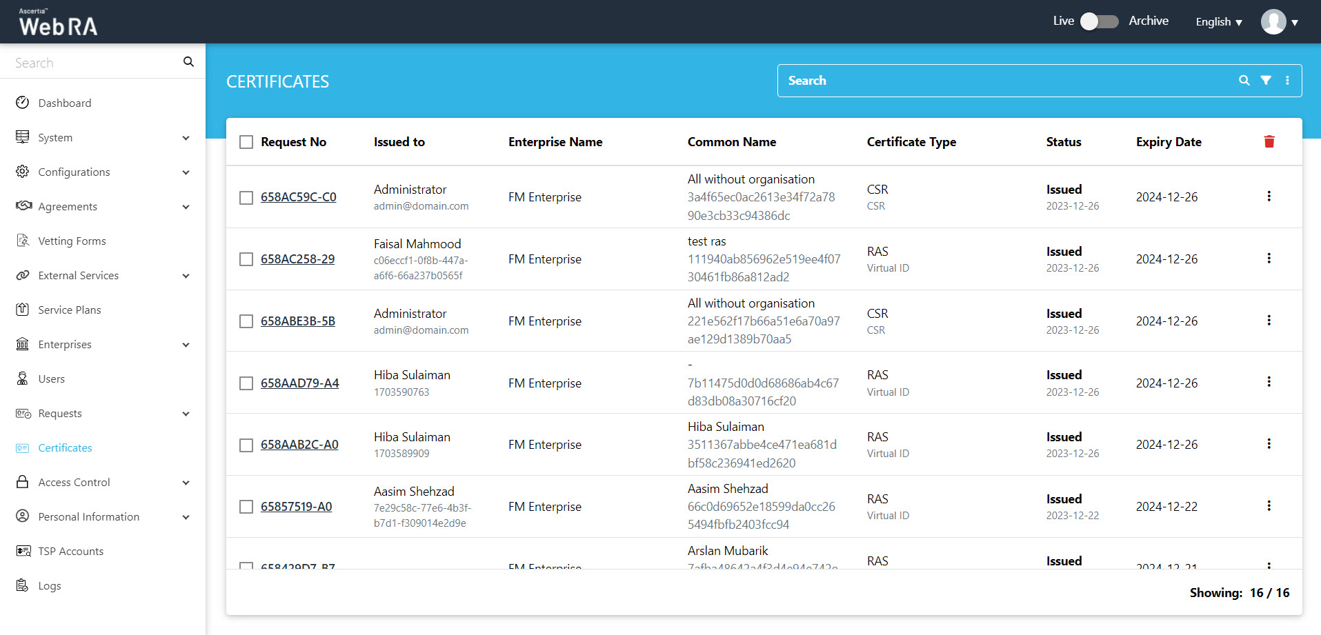 - An Admin RAO can see list of all issued certificates regardless of the enterprise affiliation