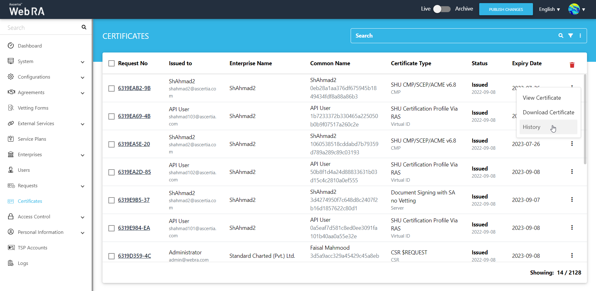 ADSS Web RA allows its users to view Certificate History for rekeyed and reissued certificates.