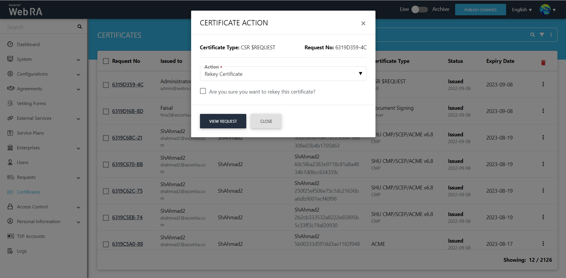 An administrator can rekey their certificates from certificate listing. When an operator clicks on the