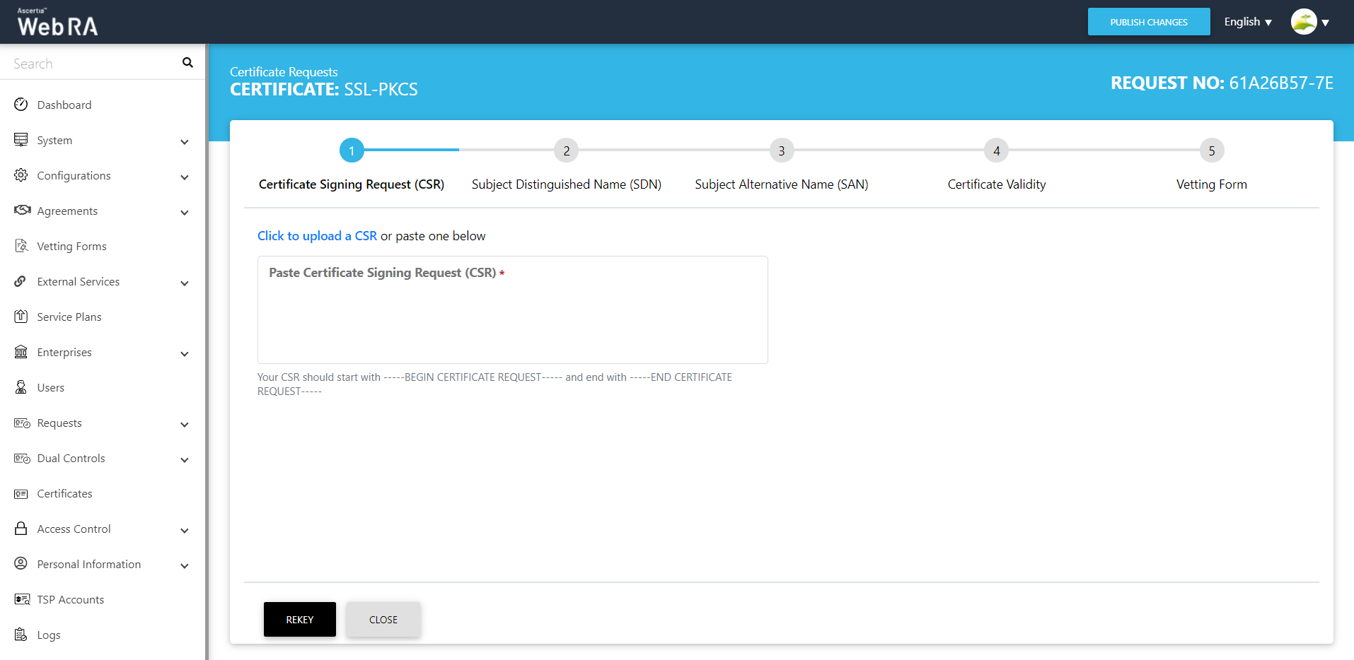 - In case of CSR ($PKCS10 or $Request) request form will be disabled and the user will not be able to edit the request form after uploading the CSR.