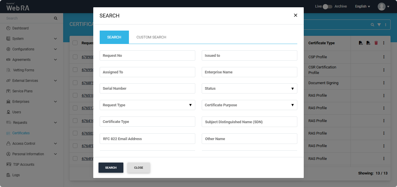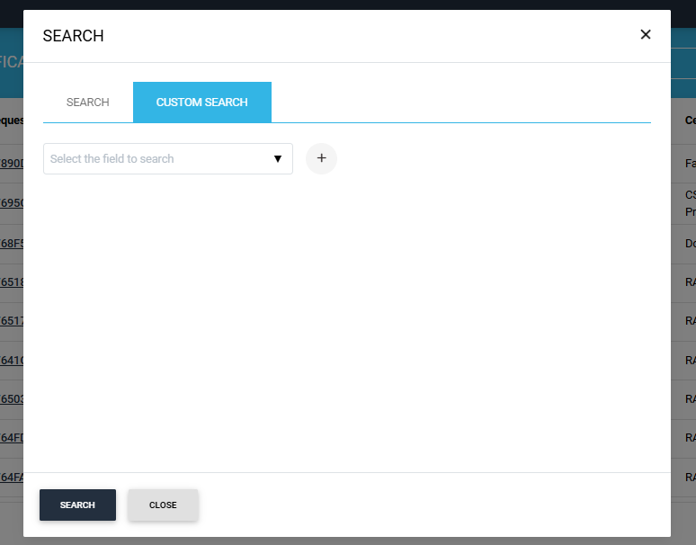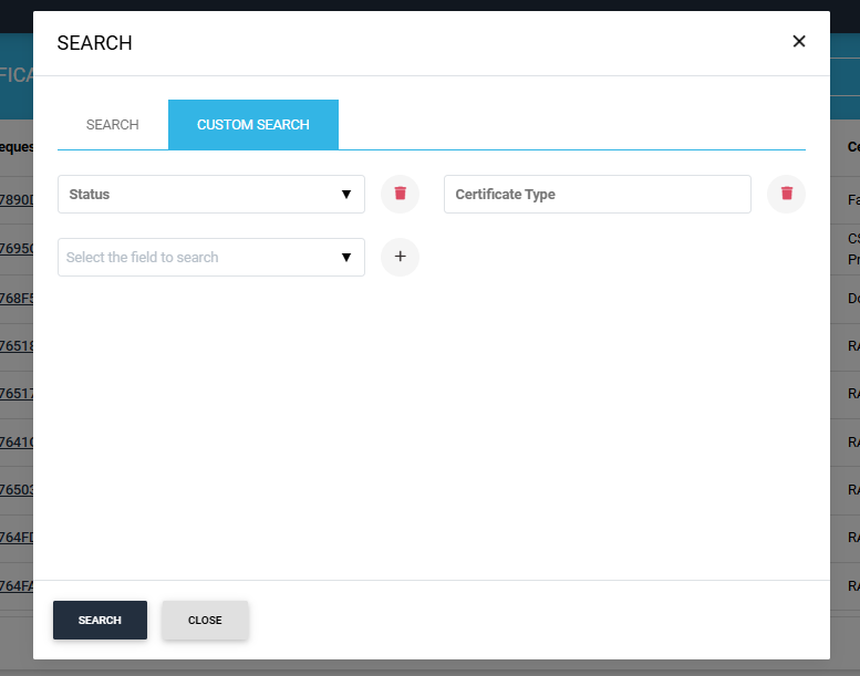 Meanwhile, users can perform a custom search for certificates from the 'Custom Search' tab. In this tab, they can add the desired filters one by one using the dropdown field.
