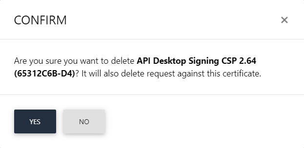 - A confirmation dialog will appear as displayed below. It will also delete certificate (s) against this request,