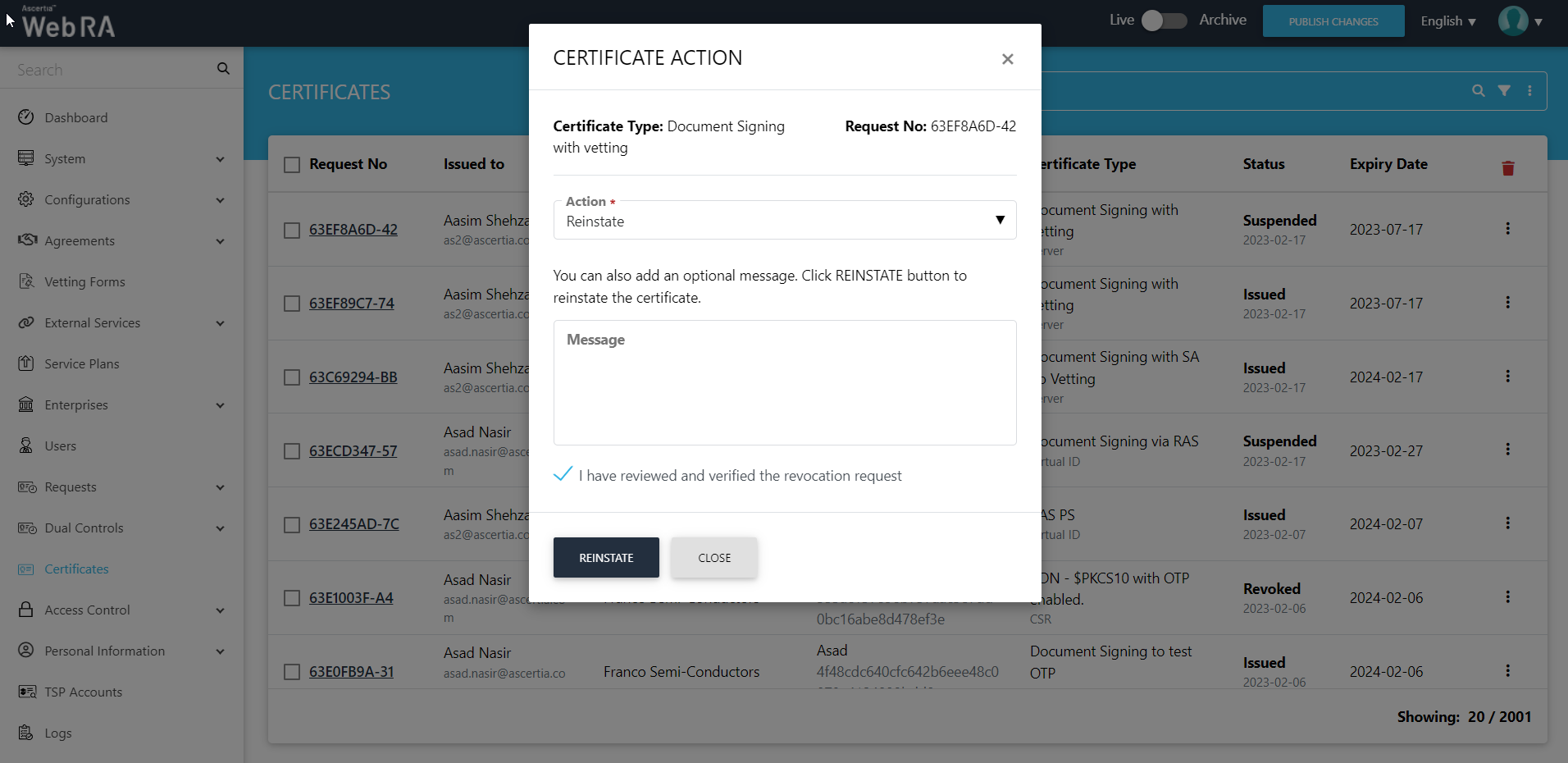 An administrator can also reinstate a suspended certificate from certificate listing. When an operator clicks on the