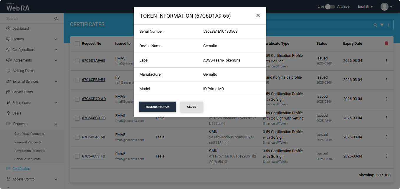 If the operator clicks on the "Resend PIN/PUK' button, the values will be shared with the user via Email or SMS or on both platforms. The mechanism to receive the PIN/PUK values is selected during the creation of certification profile.