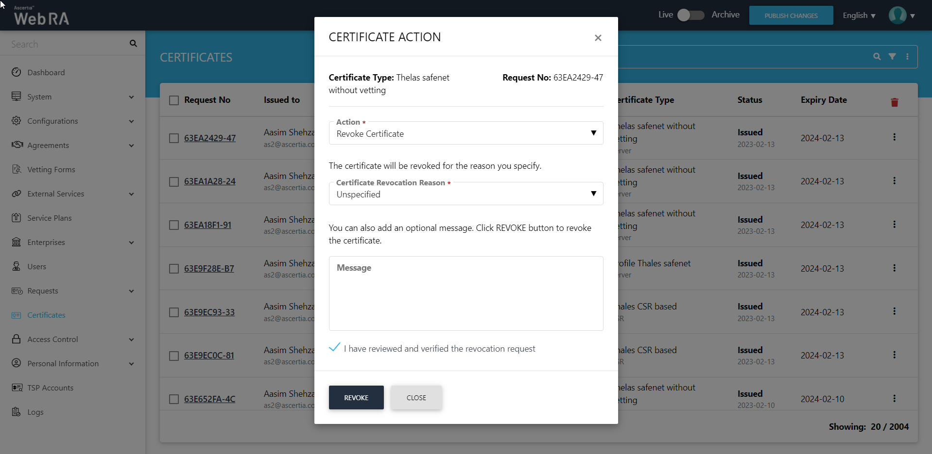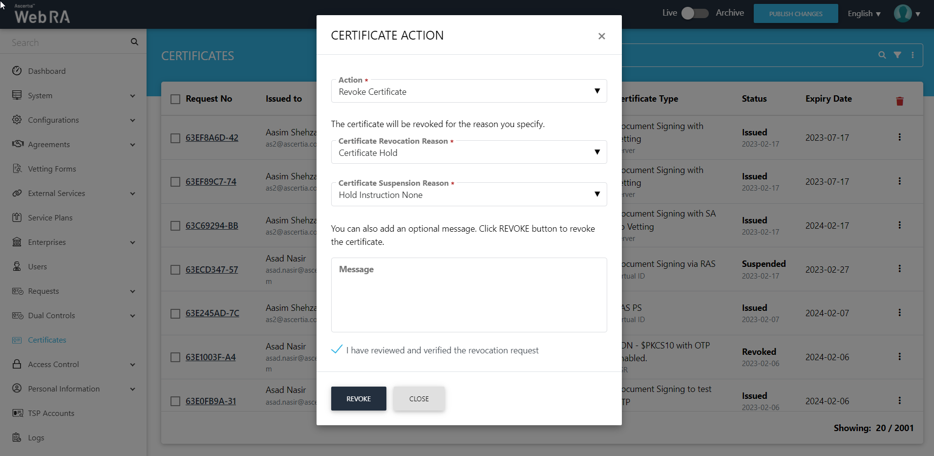 Once you select the action, certificate revocation reason drop down will be displayed, you can also add an optional message, tick the confirmation message and click "Revoke". Then the OTP screen will appear:
