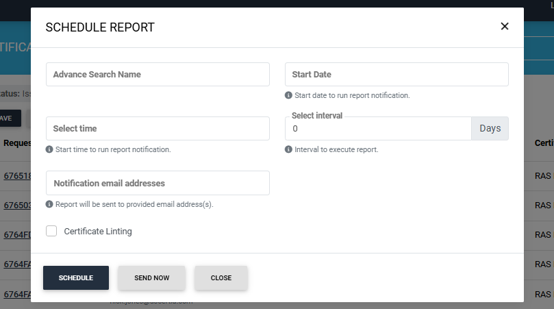 If a user has applied an advanced search filter and wants to create a report of all the certificates that appear based on that search, they can use the ‘Schedule Report’ option.