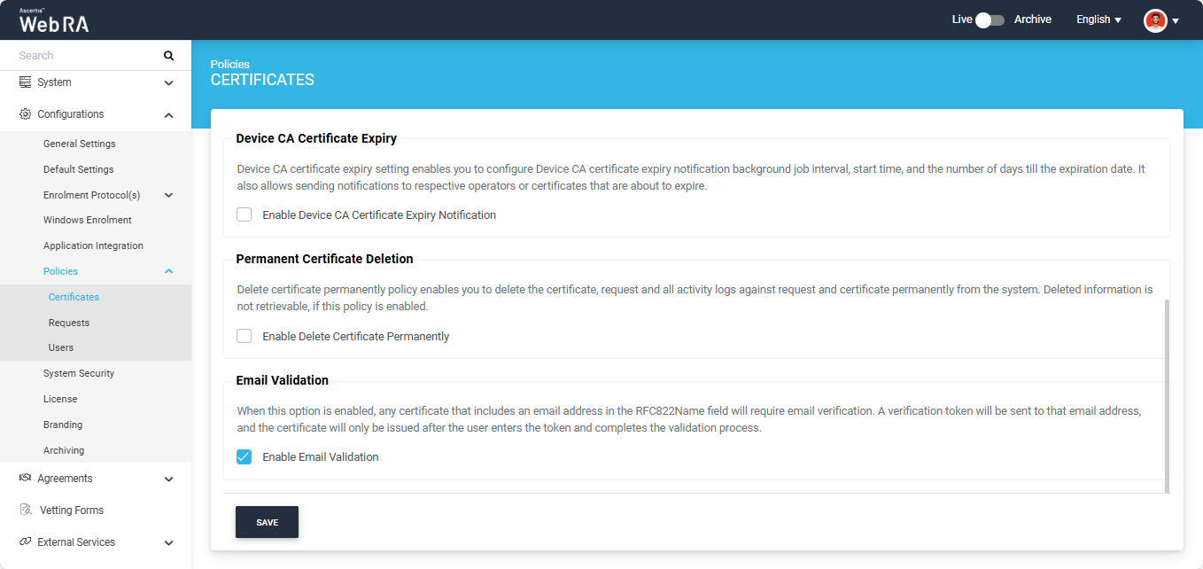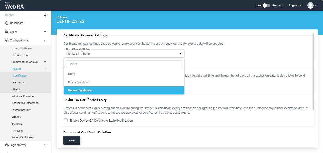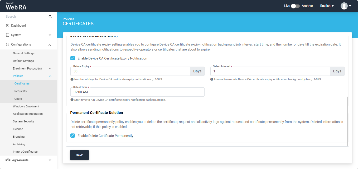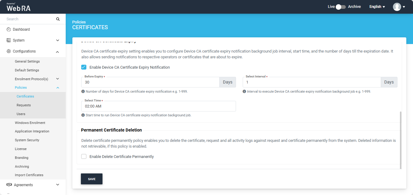 - Select the 'Enable Delete Certificate Permanently' check box and click Save.