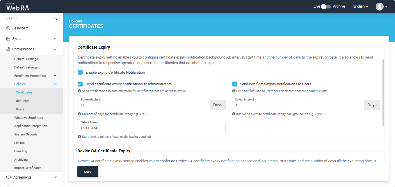 When an operator enables the 'Device CA Certificate Expiry' checkbox, the following fields will appear, as displayed in the screenshot below: