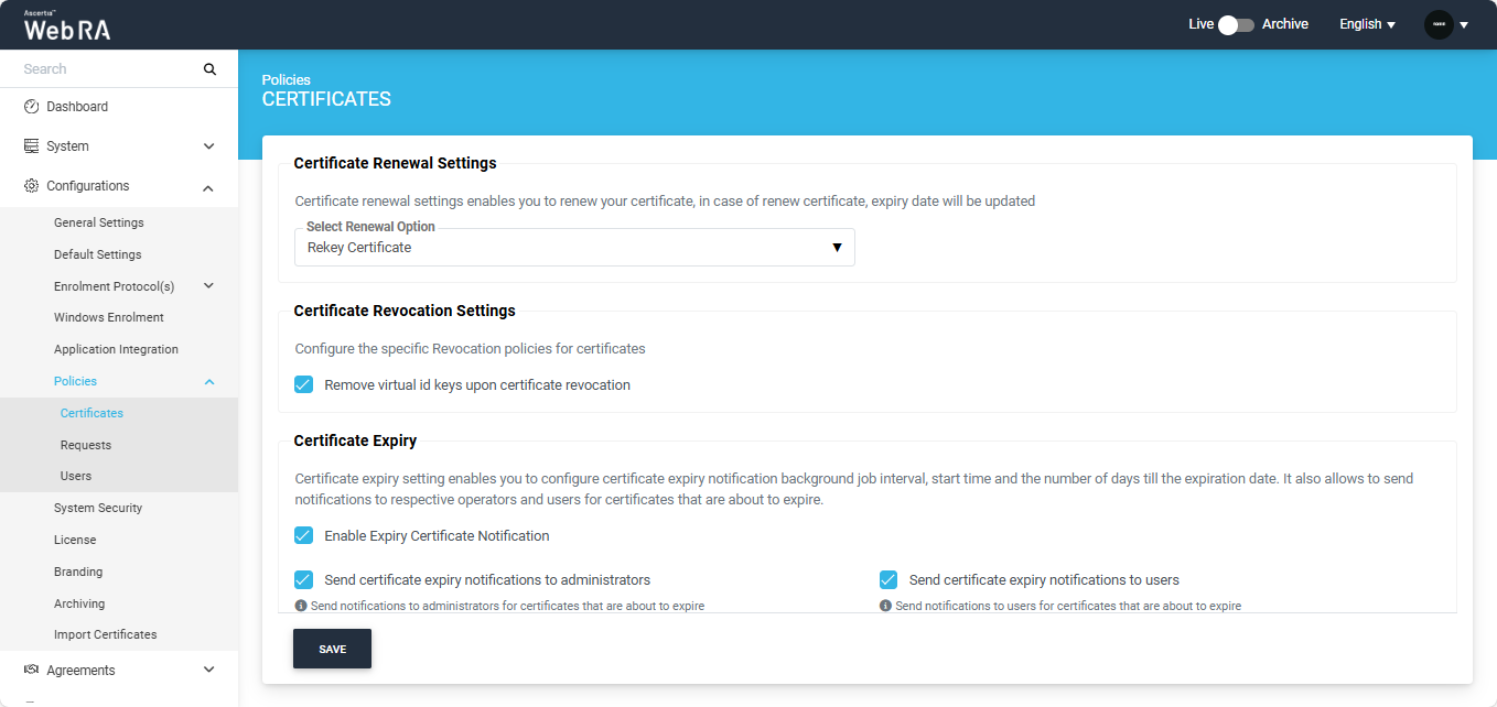 ADSS Web RA allows an operator to set the permanent certificate deletion policy. Delete certificate permanently policy enables you to delete the certificate, request and all activity logs against request and certificate permanently from the system. Deleted information is not retrievable, if this policy is enabled.
