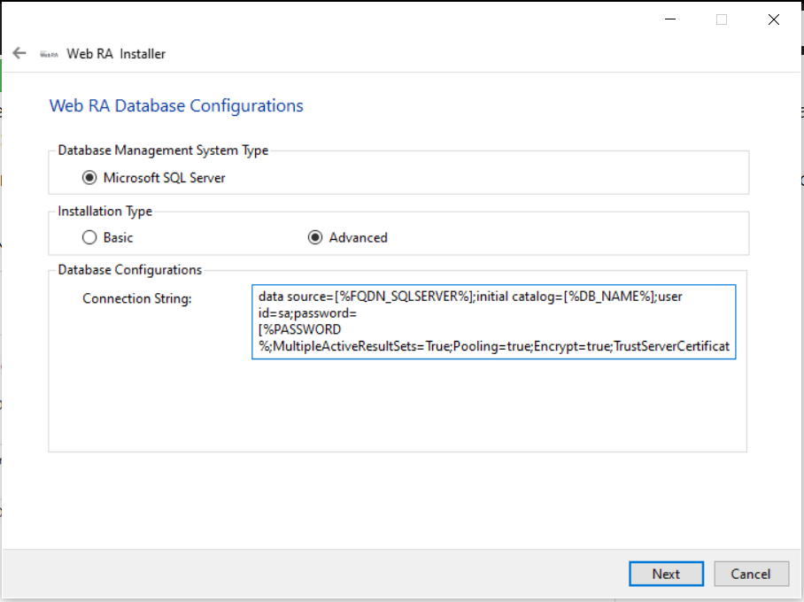 connectionString="data source={%FQDN_SQLSERVER%},1433;initial catalog={%DB_NAME%};user id=sa;password={%PASSWORD%};MultipleActiveResultSets=True;Pooling=true;Encrypt=true;TrustServerCertificate=false"