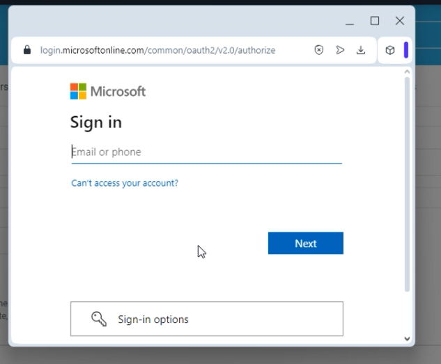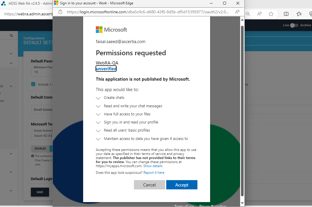 Once the setting is enabled, the system will display a ‘Microsoft: Sign in to your account’ popup, where the operator will be required to ‘Accept’ the requested permissions.