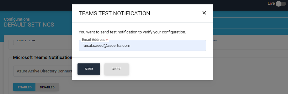 Once the ‘Sign-In’ process is complete, the system will display a ‘Team Test Connection’ popup. This popup allows the operator to send test notification to verify the configuration.