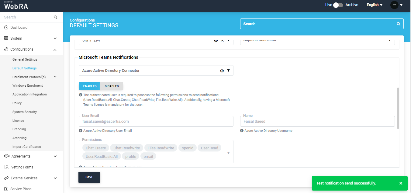 This section enables the configuration of ‘Azure Active Directory Connector’ that allows an operator to receive system notifications directly in their Microsoft Teams application.