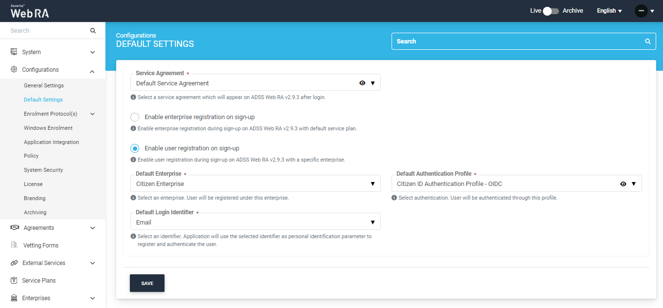 - Enterprise registration - An operator will enable enterprise registration on sign-up. This means that an enterprise will be registered to ADSS Web RA Server using an email address.