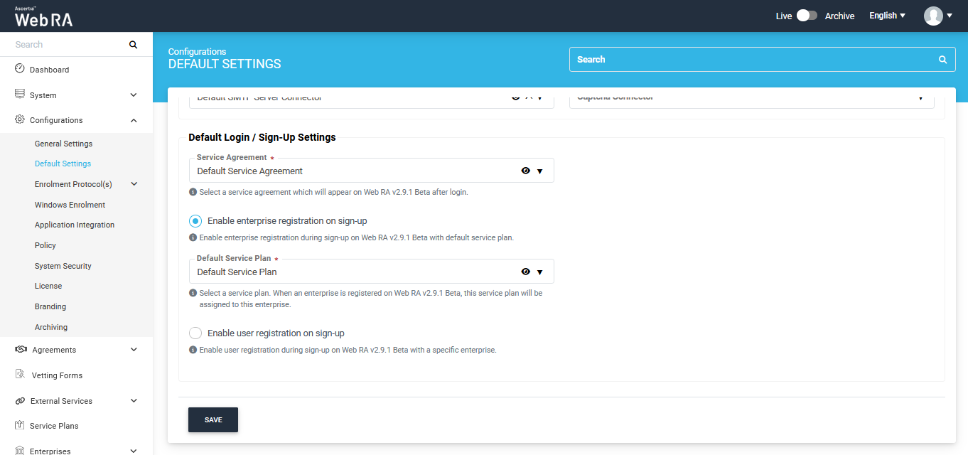 Select this radio button if you want to enable enterprise registration during sign-up on Web RA with default service plan. A user can sign-up through his email ID. In this an enterprise will be registered and a default service plan will be assigned to it. |