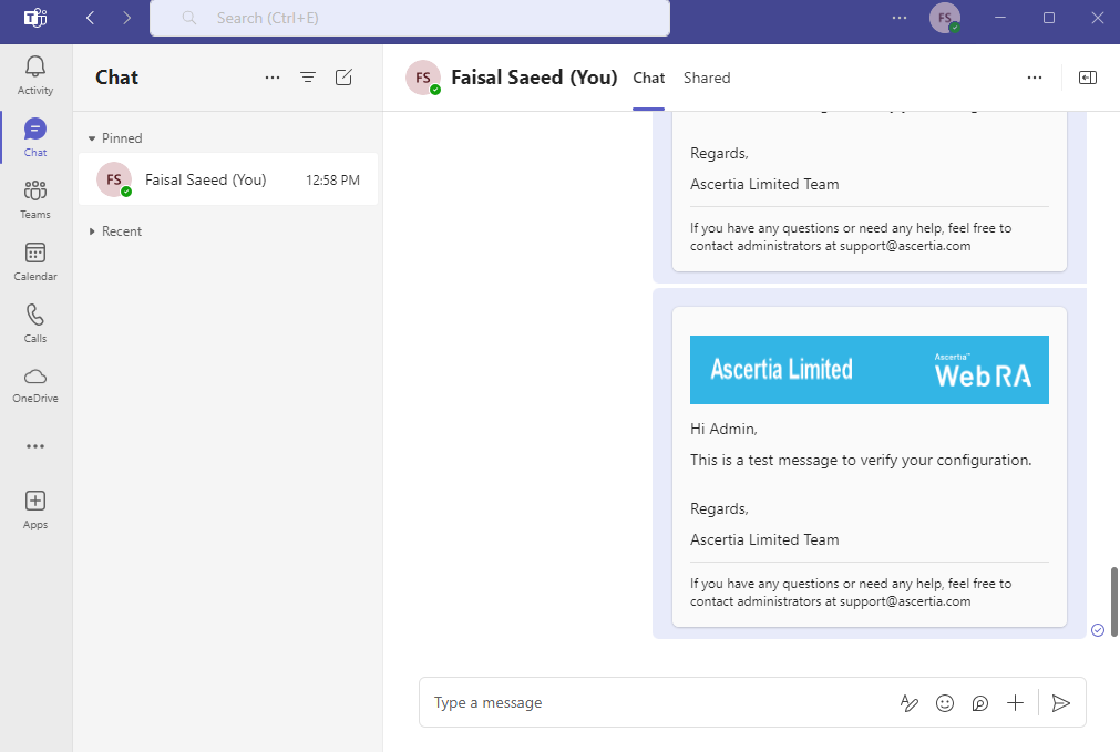 Moreover, the user will receive a message in the Microsoft Teams application regarding the verification of the configuration.