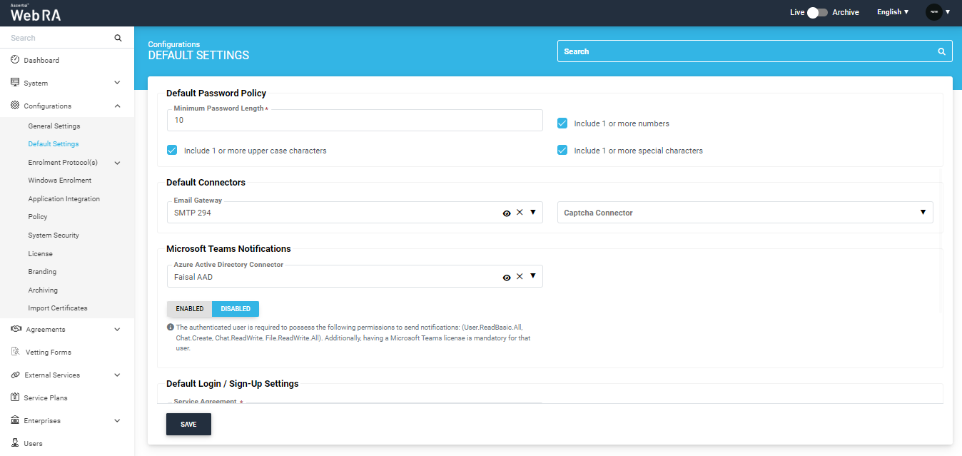 There are some default settings that will automatically apply for new users and enterprises. The users and enterprises will be able to change these settings by themselves if allowed by the ADSS Web RA administrator.