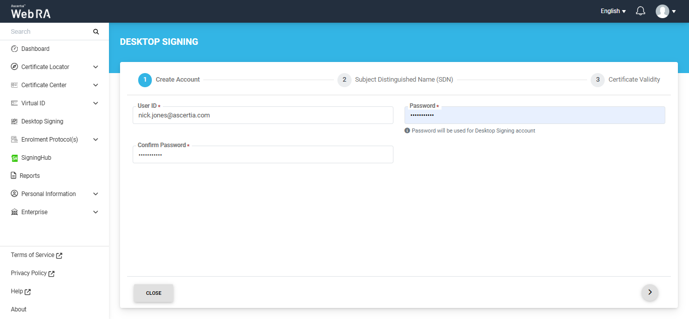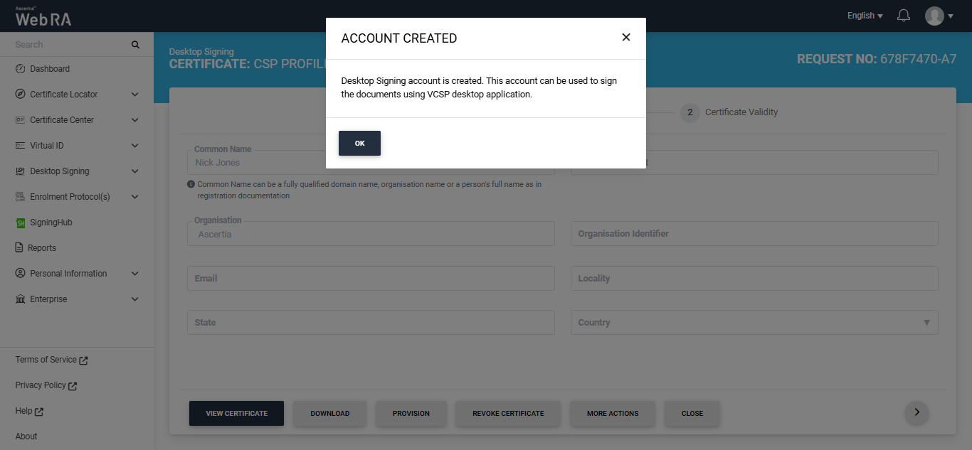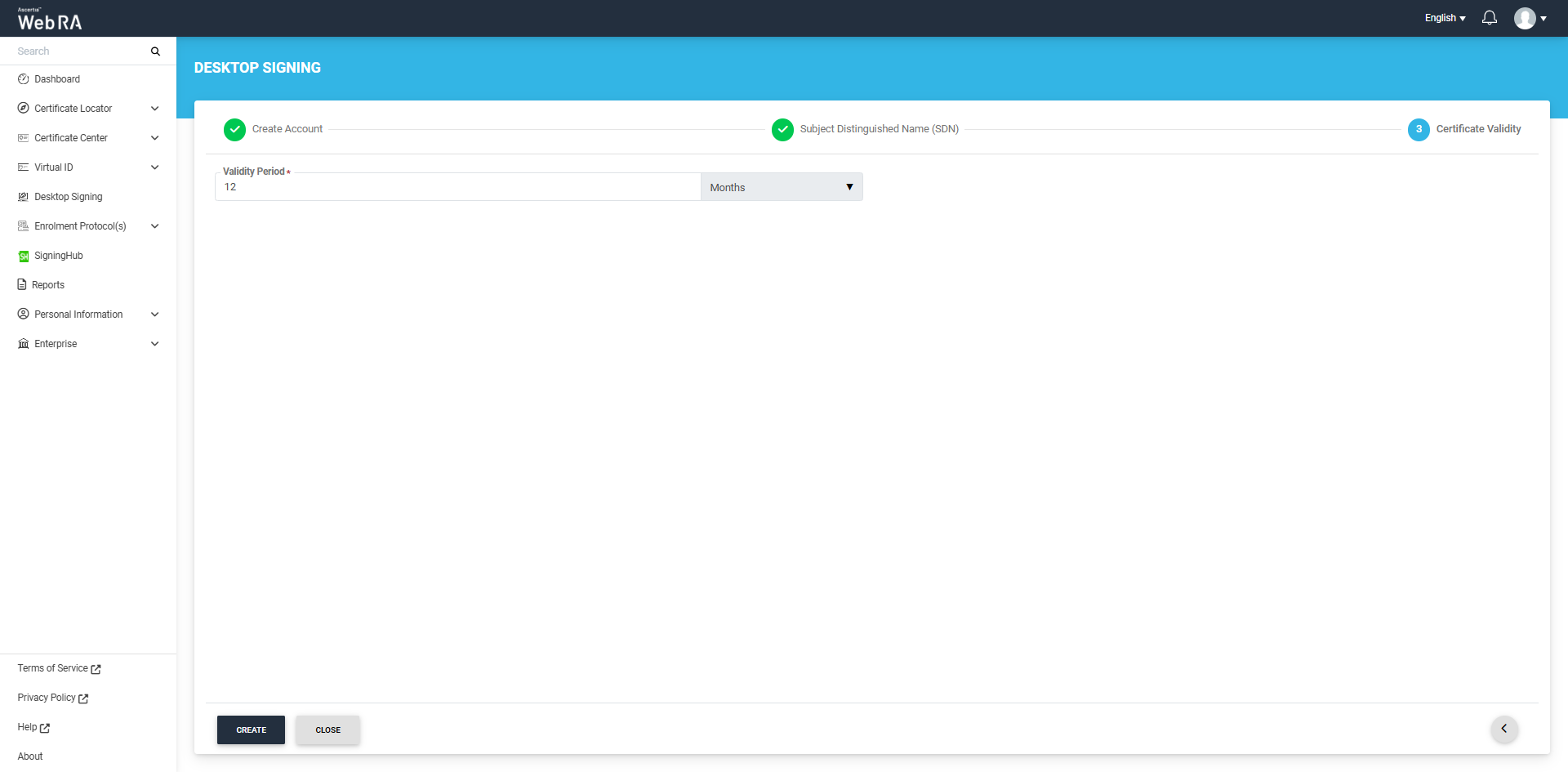 After specifying the validity period, click the 'Create' button. The system will create your account, generate your Desktop Signing certificate and download it in your system.