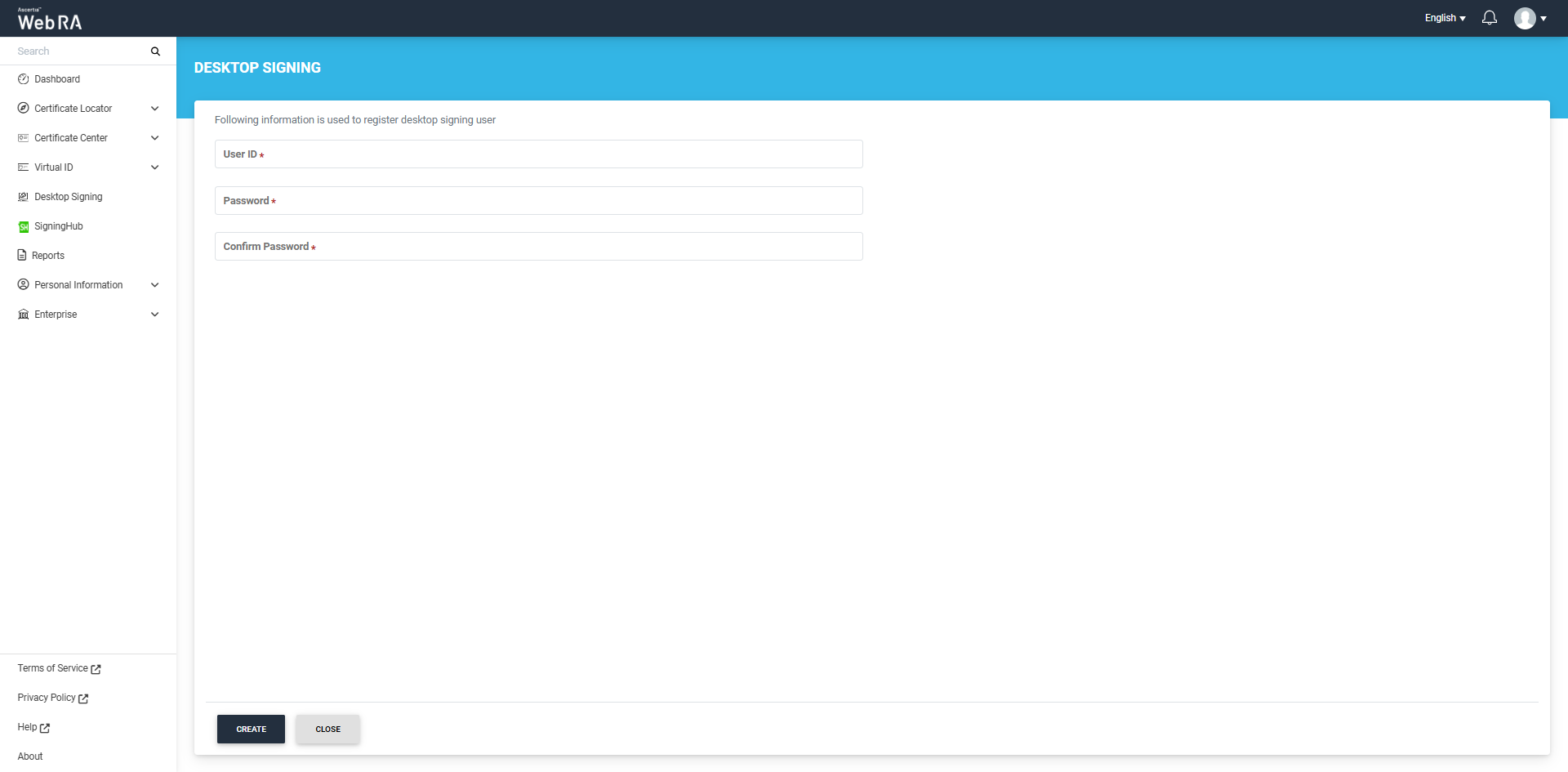 Navigate to the Desktop Signing tab from the left menu in the Web RA web portal, and click on 'Create' button.