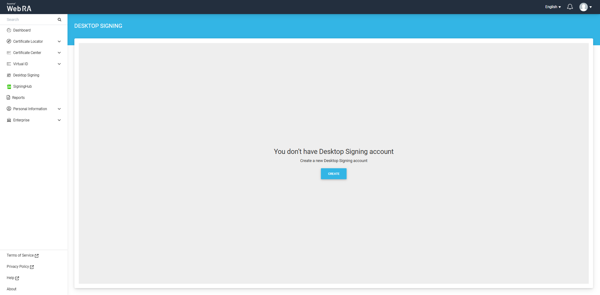 Navigate to the 'Desktop Signing' tab from the left menu, and the 'Create button will appear on the screen. This button enables you to create a Desktop Signing account for the first time.