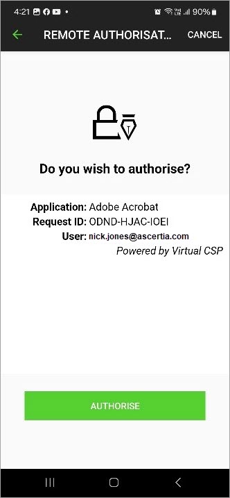 The VCSP application will send a signing request to the Go>Sign Mobile app for authorisation. Install the Go>Sign Mobile App, configure it and register the device. Then approve the request under the "Remote Authorisation" section.