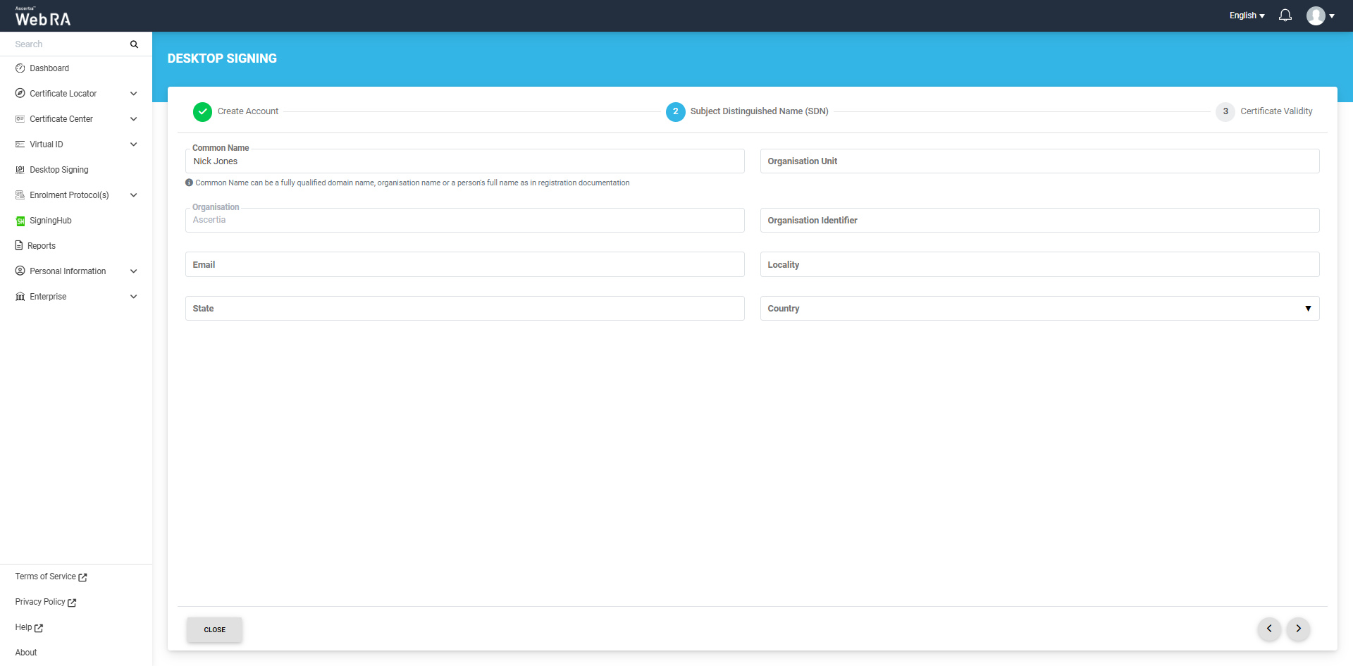 You will need to provide your user ID, password, full legal name, and other organisation-related information for certificate generation. Select the validity period for your certificate (if allowed by your Enterprise RAO).