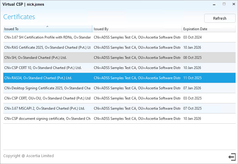 After logging in, the VCSP application will display a list of all provisioned certificates in desktop signing account.