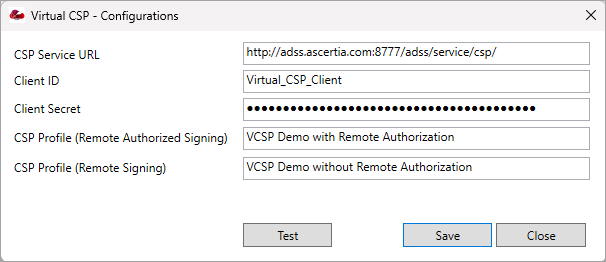 After installation, provide the configuration details in the ‘Virtual CSP – Configurations’ file. For that, navigate to "C:\Program Files (x86)\Ascertia\Virtual CSP", then double-click the 'VirtualCSP.Configuration' file to access configuration dialog.