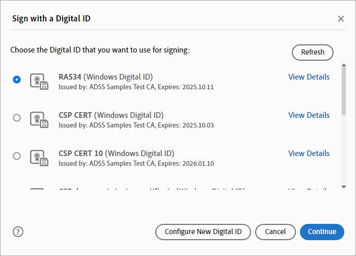 A dialog titled ‘Sign with a Digital ID’ will appear, displaying all available certificates. Choose the digital ID you want to use for document signing and click ‘Continue’.