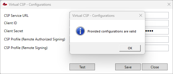 Click the ‘Test’ button to verify if the details you entered are valid and functioning. If the details are correct, a dialog will appear confirming that the configurations are valid.