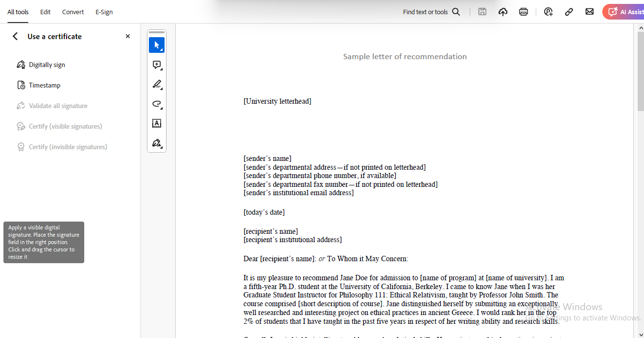 Open the PDF document you want to sign in Adobe Acrobat. Navigate to All Tools > Use a Certificate, and click on the ‘Use a Certificate’ option to view its sub-options.