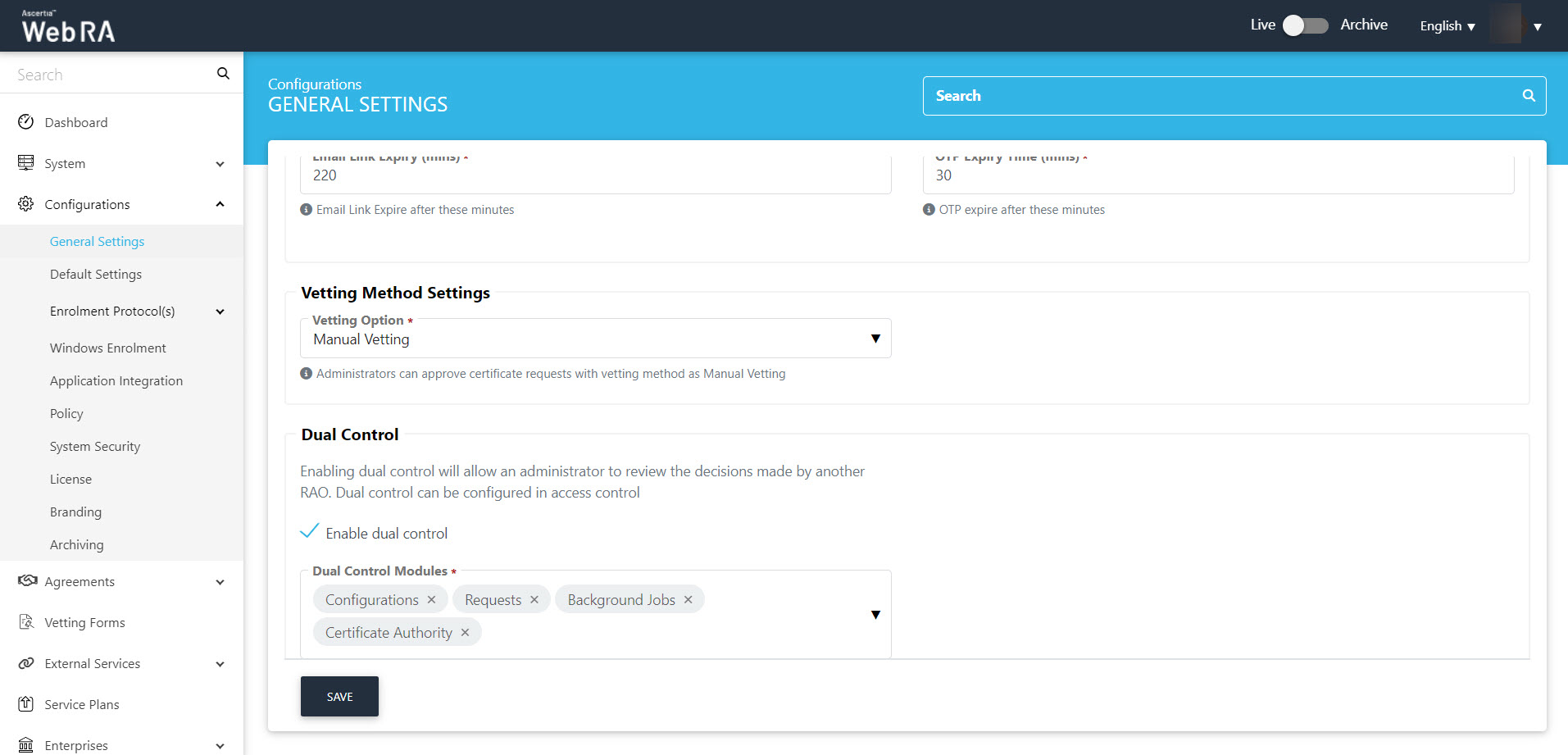 ADSS Web RA allows additional monitoring of the certificate requests by enabling dual control from Configurations > General Settings. Once the dual control is enabled, any changes in the certificate requests, configurations and background jobs made by an Enterprise RAO, will be reviewed by the Admin RAO before reaching its final status.